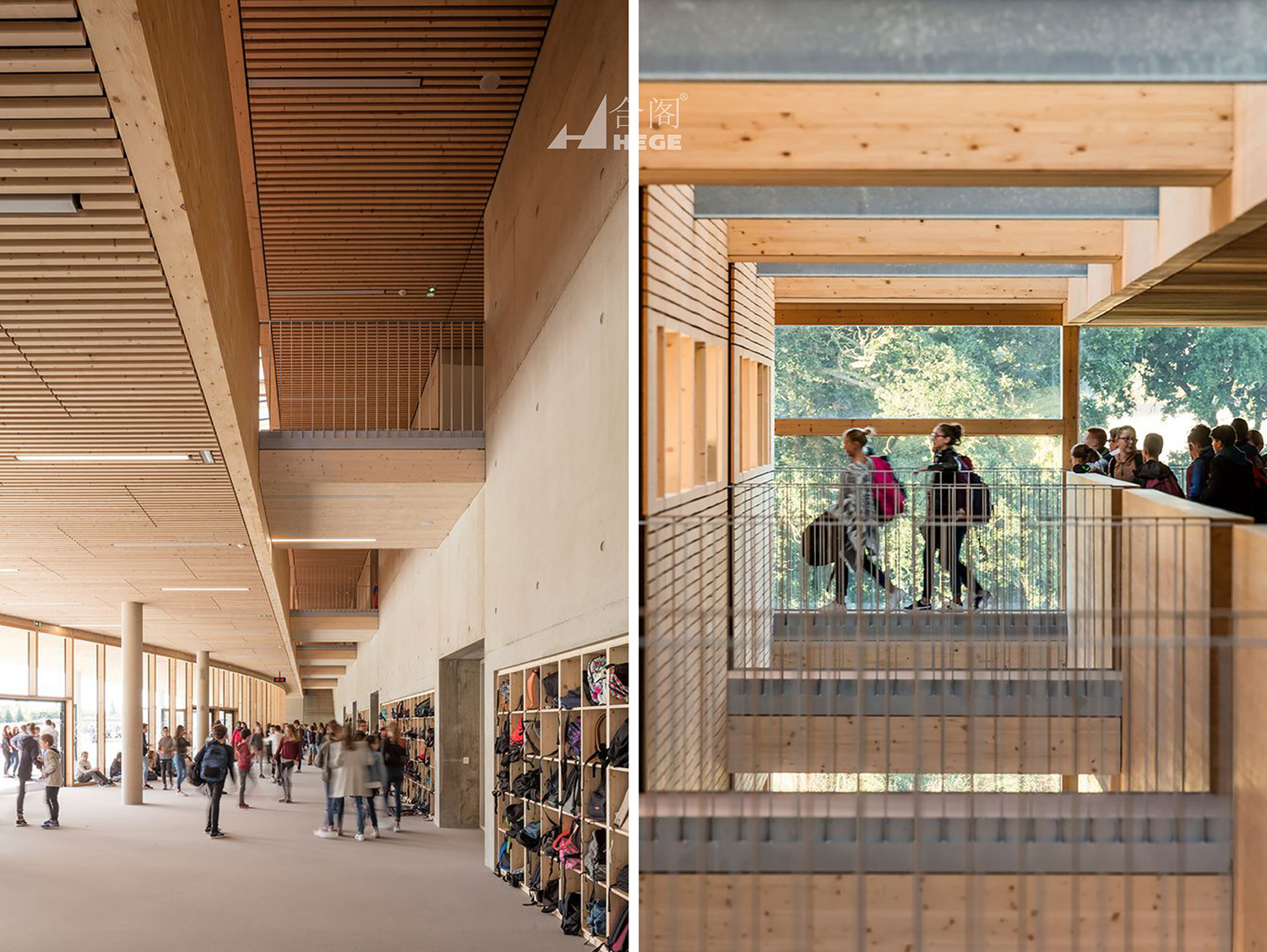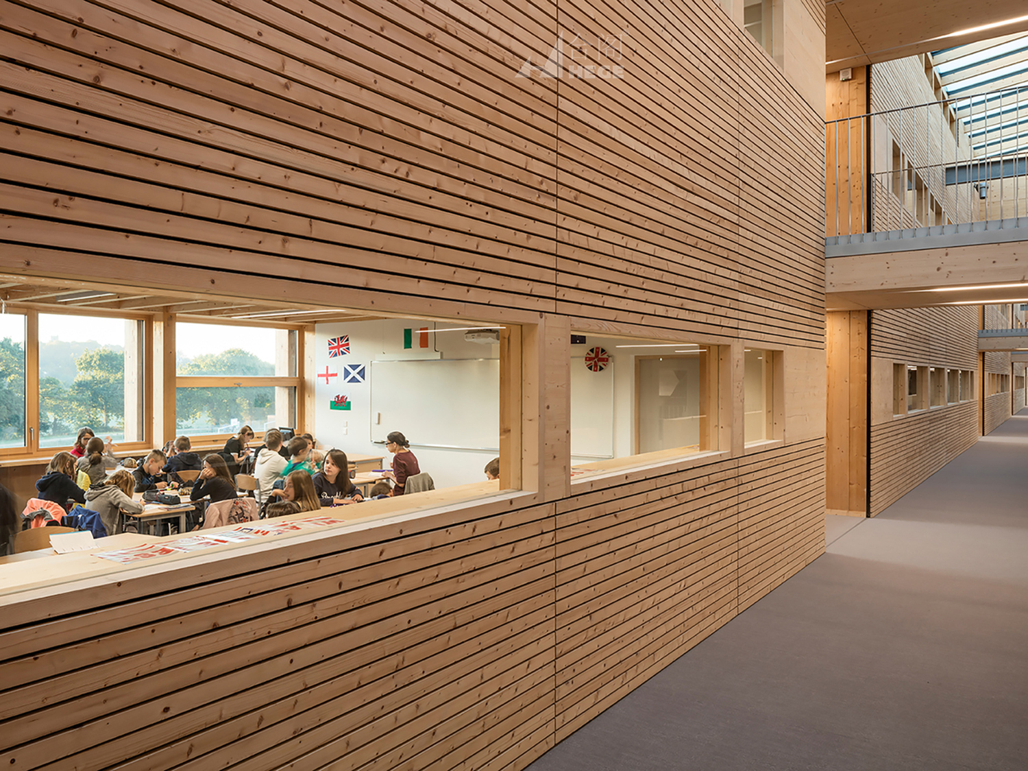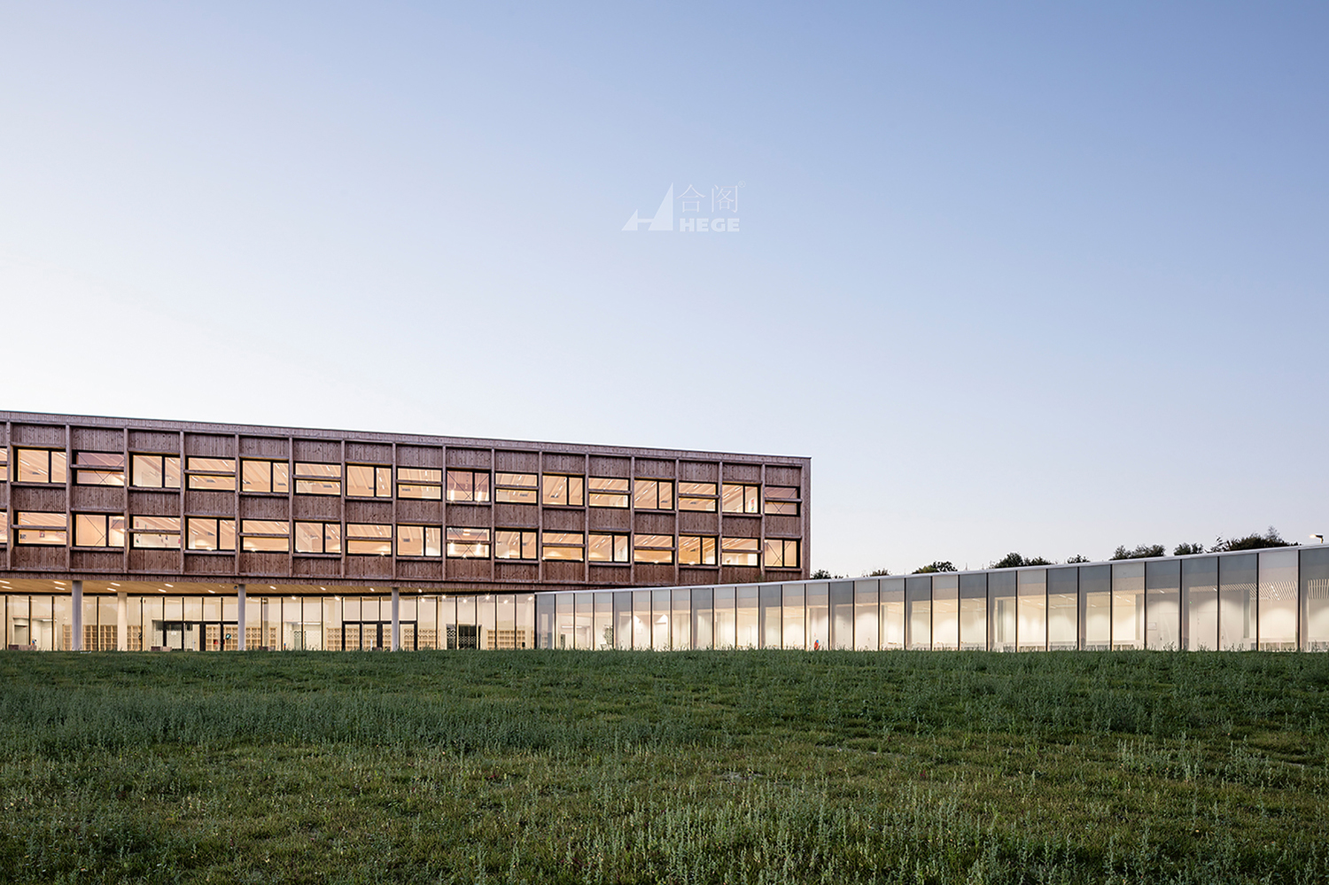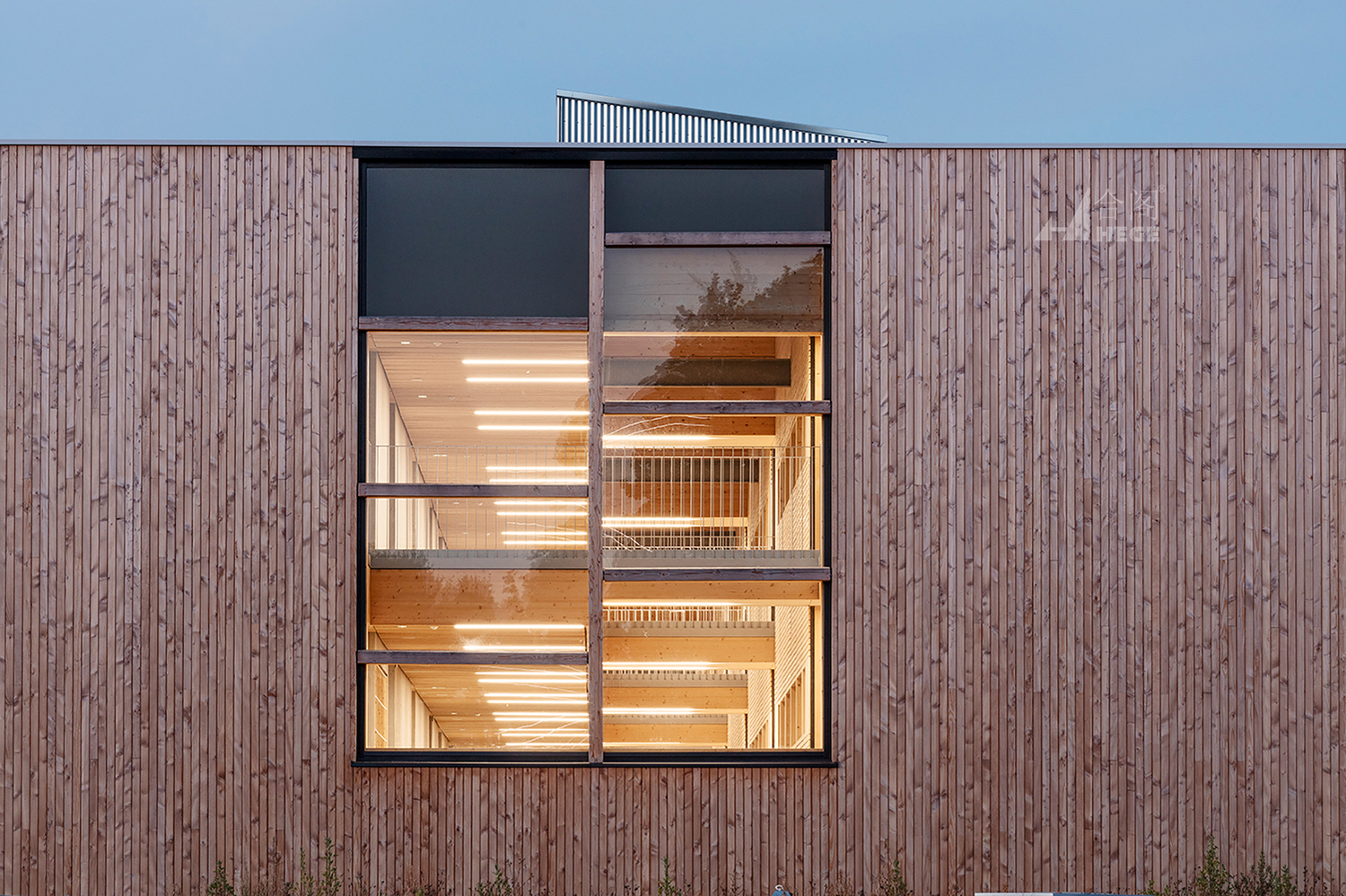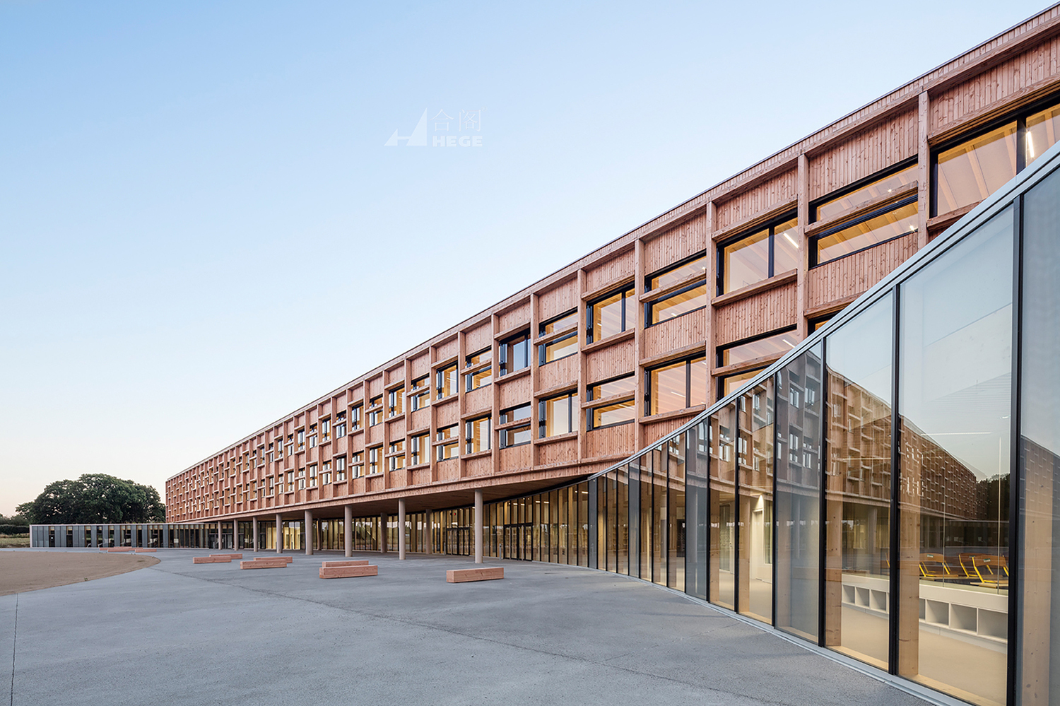 建筑底层的玻璃幕墙给建筑带来轻盈感。一层容纳了入口大厅、风雨操场、教育空间、多功能室和食堂。在面向东南和西北的立面上,垂直和水平的木制遮阳板控制着两层教室的采光量。遮阳板的使用增加了立面的厚度,它们的形状也丰富线性建筑的形式。