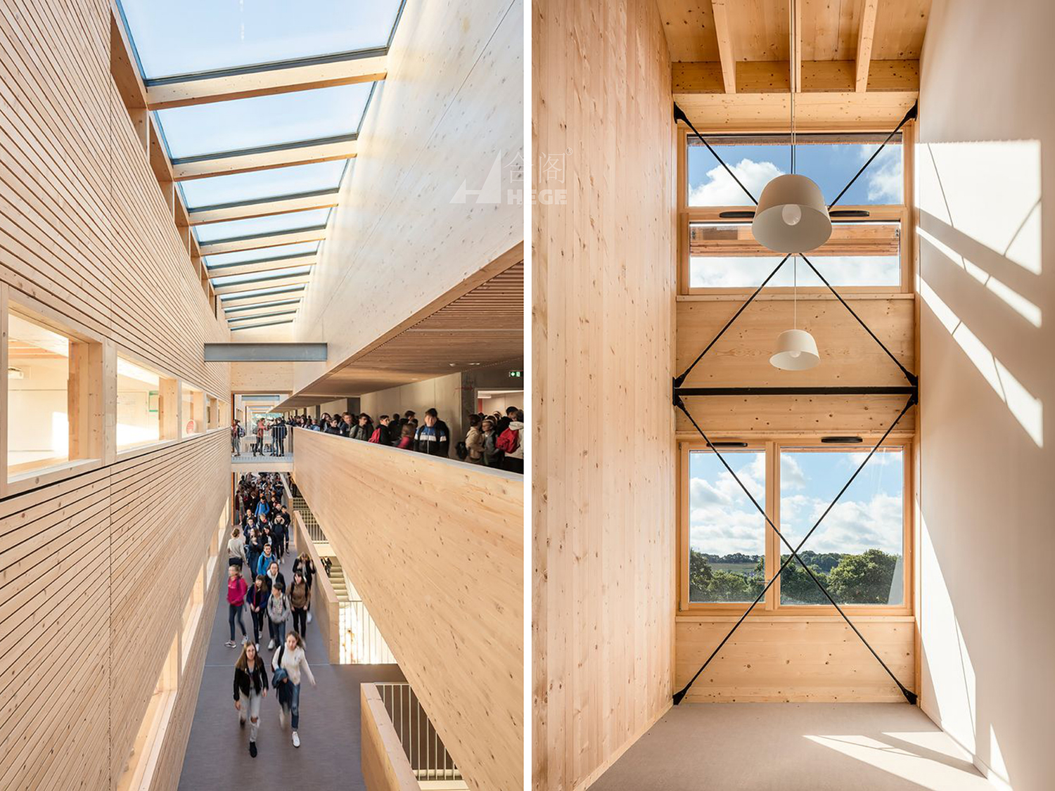 建筑内部,一个贯通三层楼的中庭为交通空间和教室提供了自然光,与紧凑的建筑形成对比。