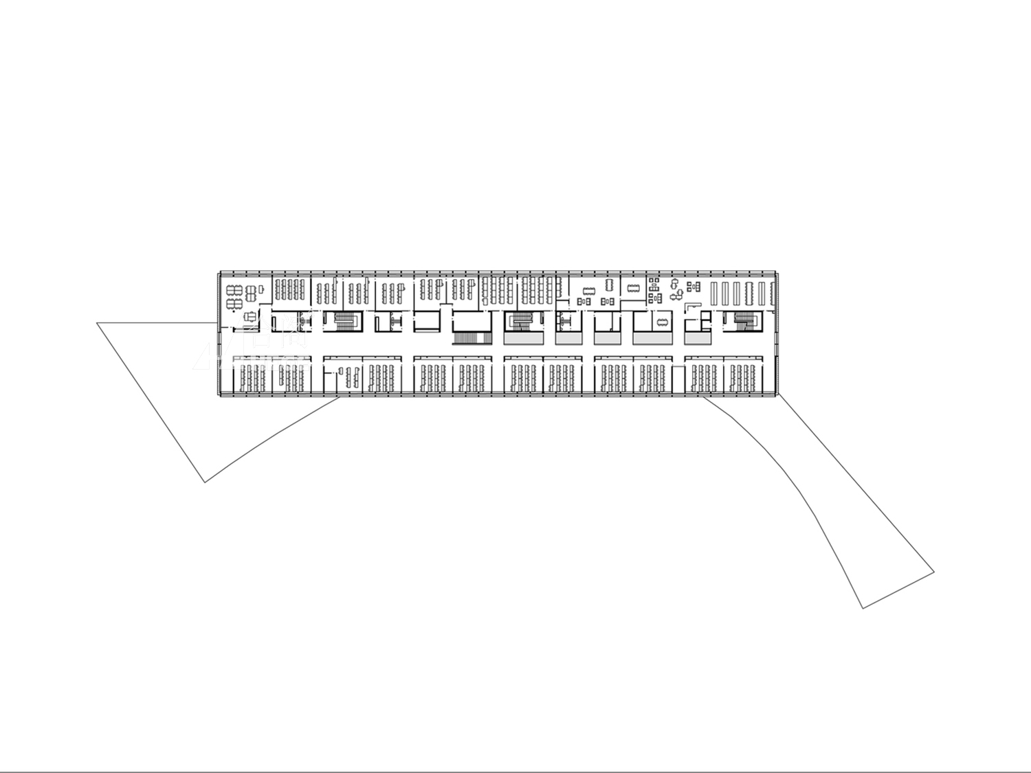 它由两个独立的建筑组成:一个长长的直线平行六面体位于轻微弯曲的基座上,以呼应场地的地形并与景观融为一体。