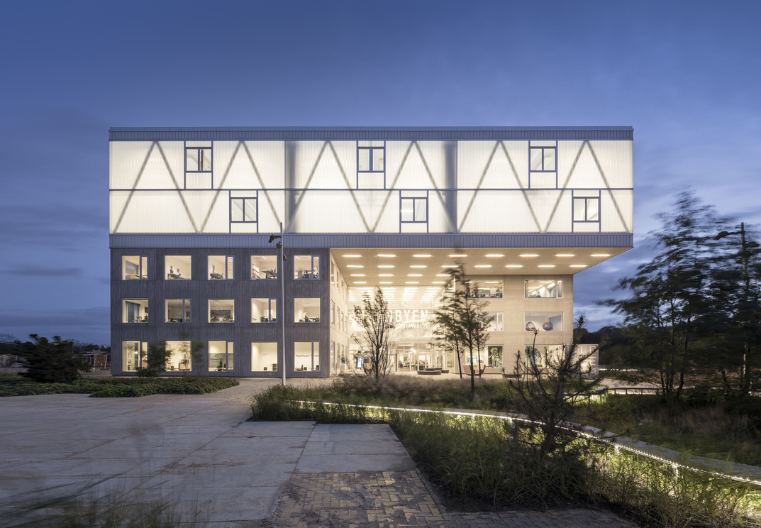 这是四个独立的体量但又在几个方面相互联系:城市的空间漂浮在入口处的建筑物上,交叉的楼梯连接三层高的中庭和顶层公共区域。顶层的体育设施在四座厚重的房屋上方盘旋,并赋予建筑以一种真正具有启发性的身份。当夜幕降临时,一个关于教育、研究和运动的活跃环境的故事拉开了序幕。