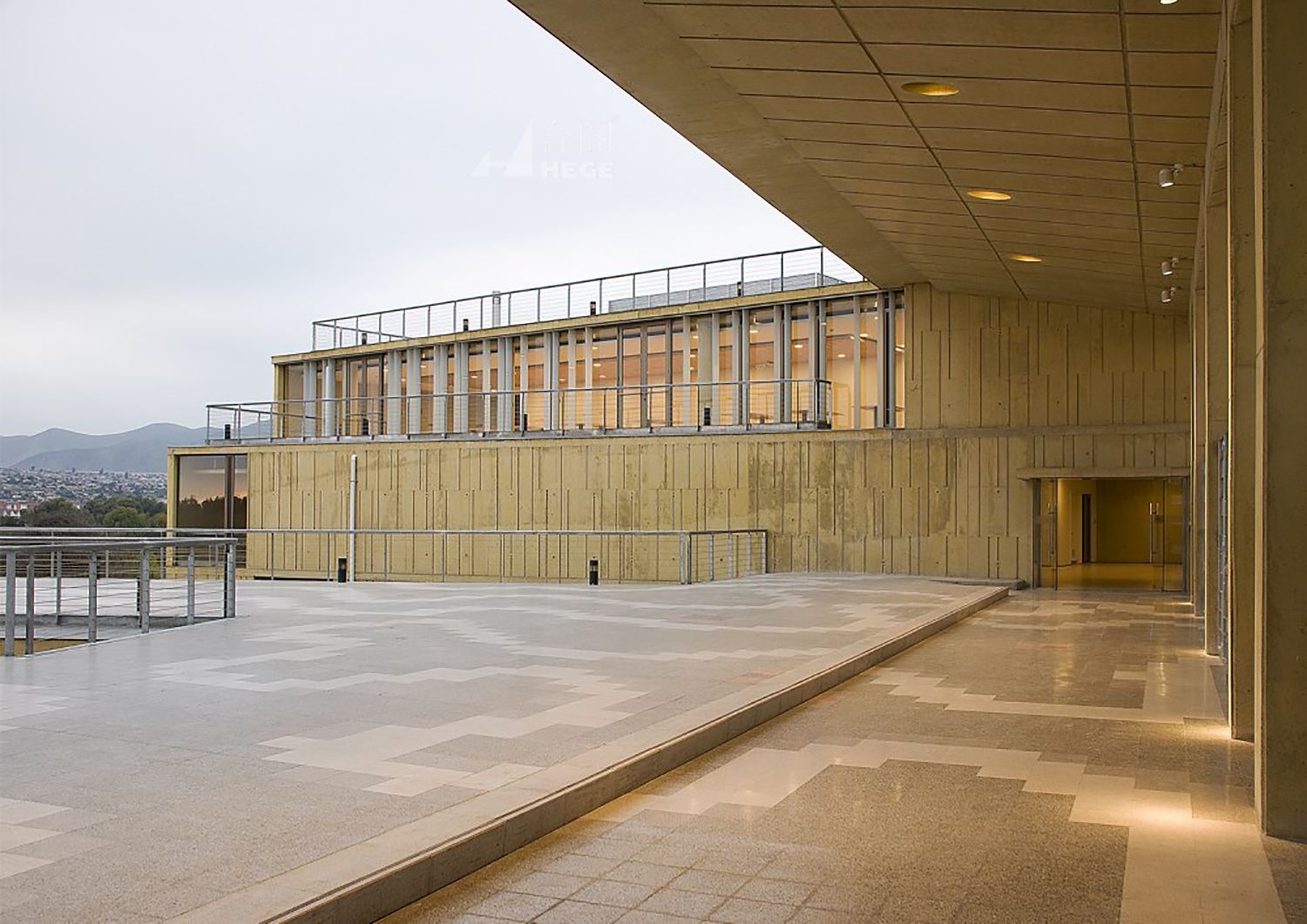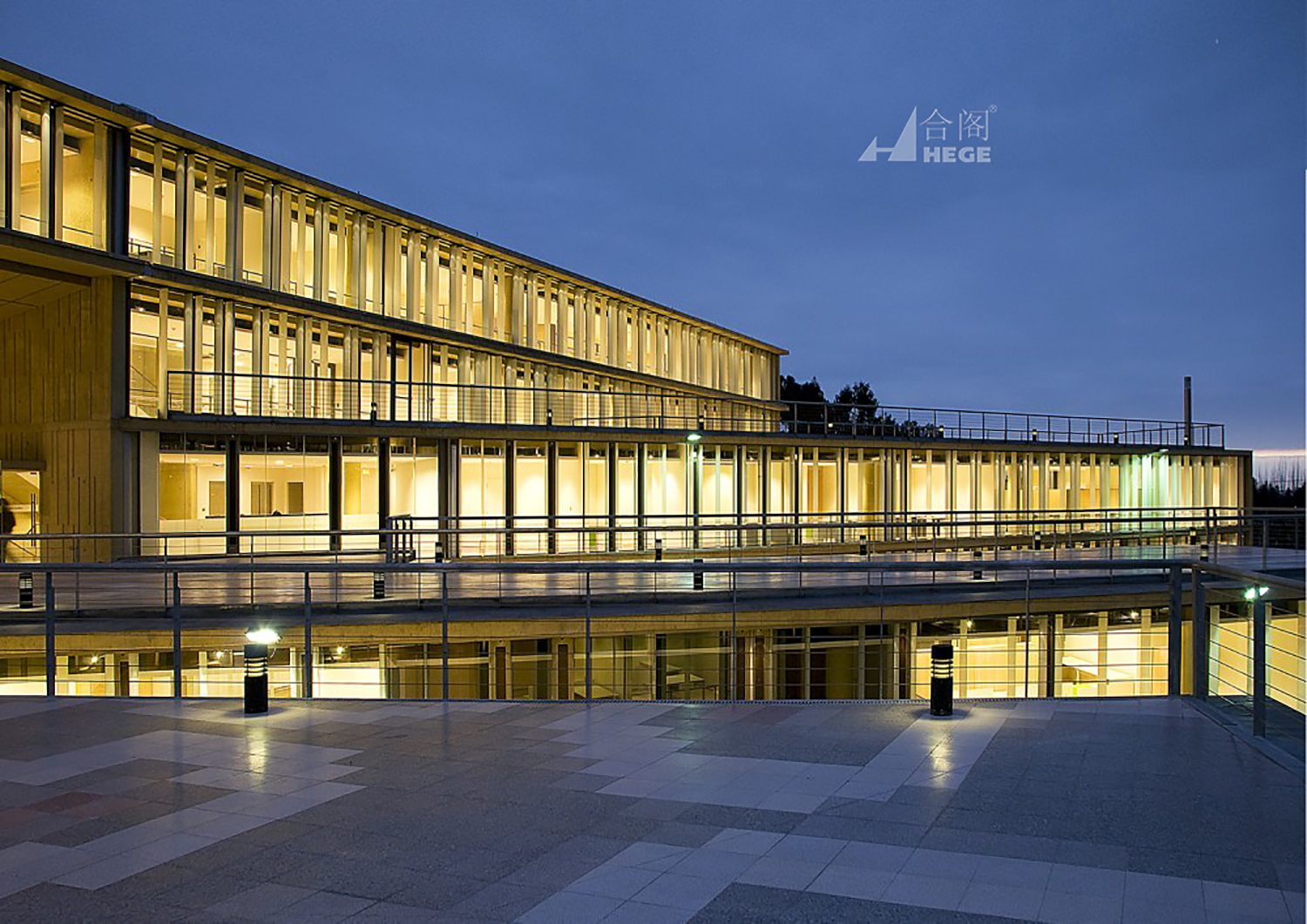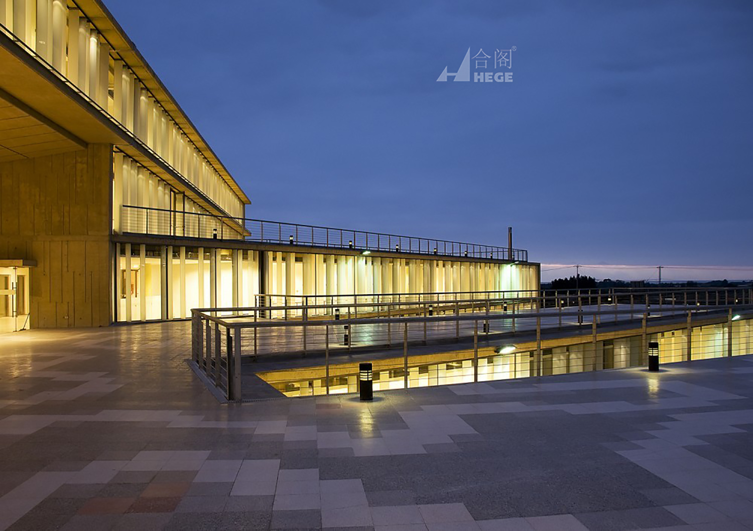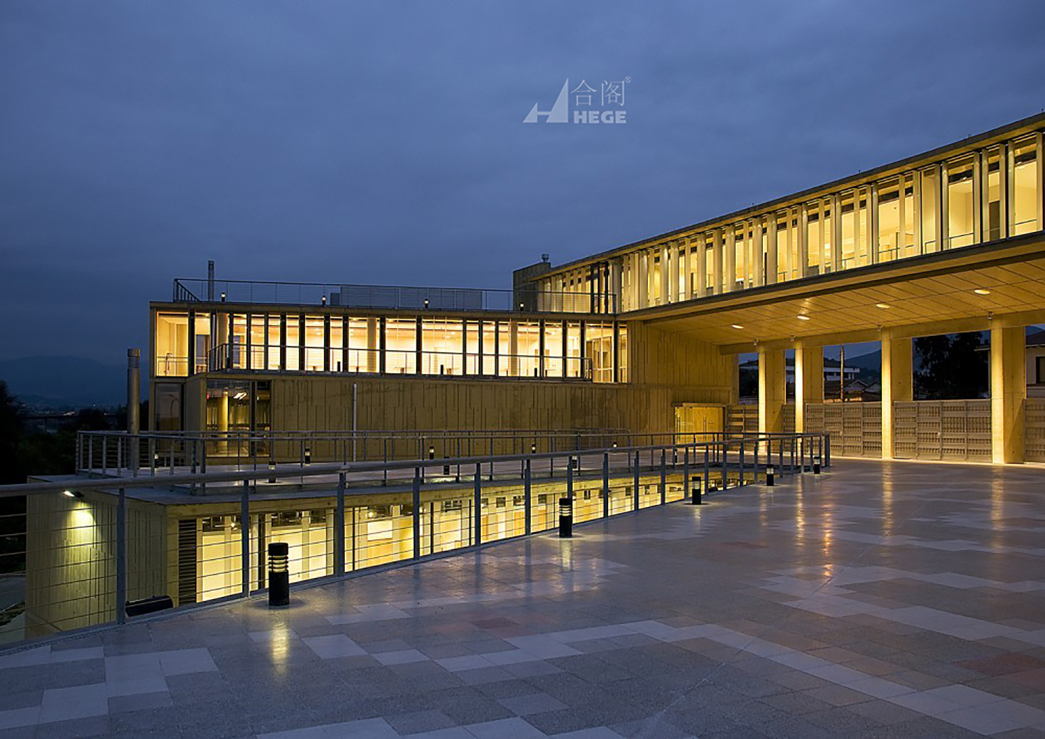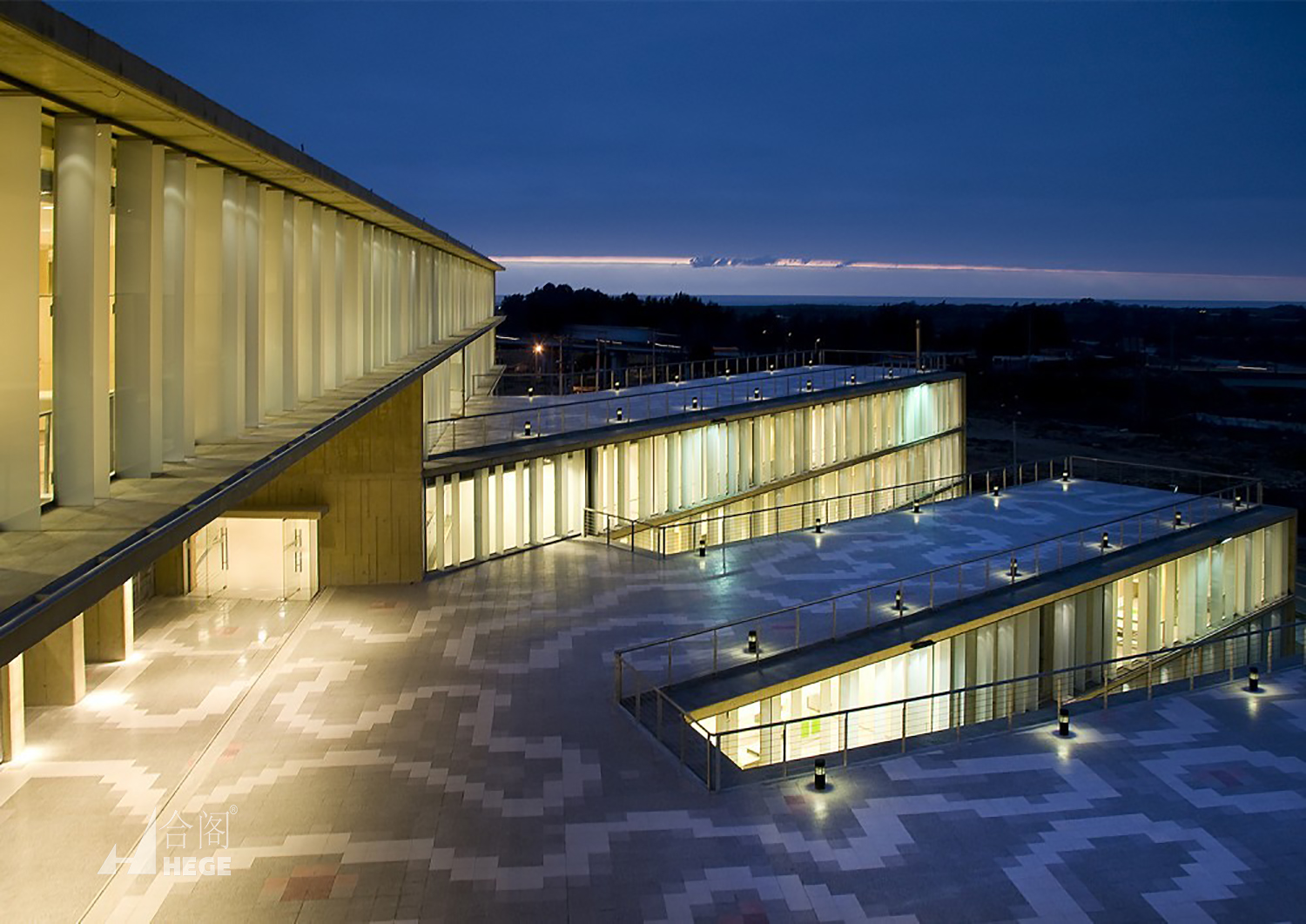建筑面向在城市与河流间的落客区分成了几个体块,并在其间形成了开放的露台。这些露台将河滨景观引入建筑,恢复了老城的视廊。两栋核心建筑被与街道平面连接的部分拱卫着。东部的体块包含大礼堂、多功能厅及在二层的餐厅。餐厅与一个开放的观景平台相连。大礼堂占用两层,因而可以从外部通过上层进入,也可以从内部的下层进入。