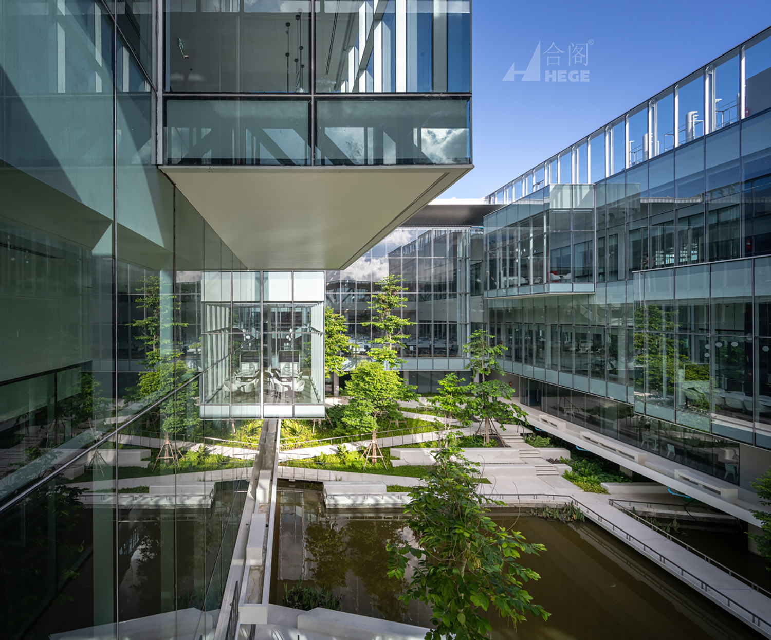 建筑双层的玻璃幕墙采用磨砂玻璃和透明玻璃交替使用,既提供了隔热的保护,又引入了外部充足的光线和宽敞的视野。同时,透过幕墙,实验室内的工作场景隐约可见,为访客提供着专业的人文景观。为了促进互动,人行道和公共区域均设有玻璃的立面,营造出明亮和开放的氛围。