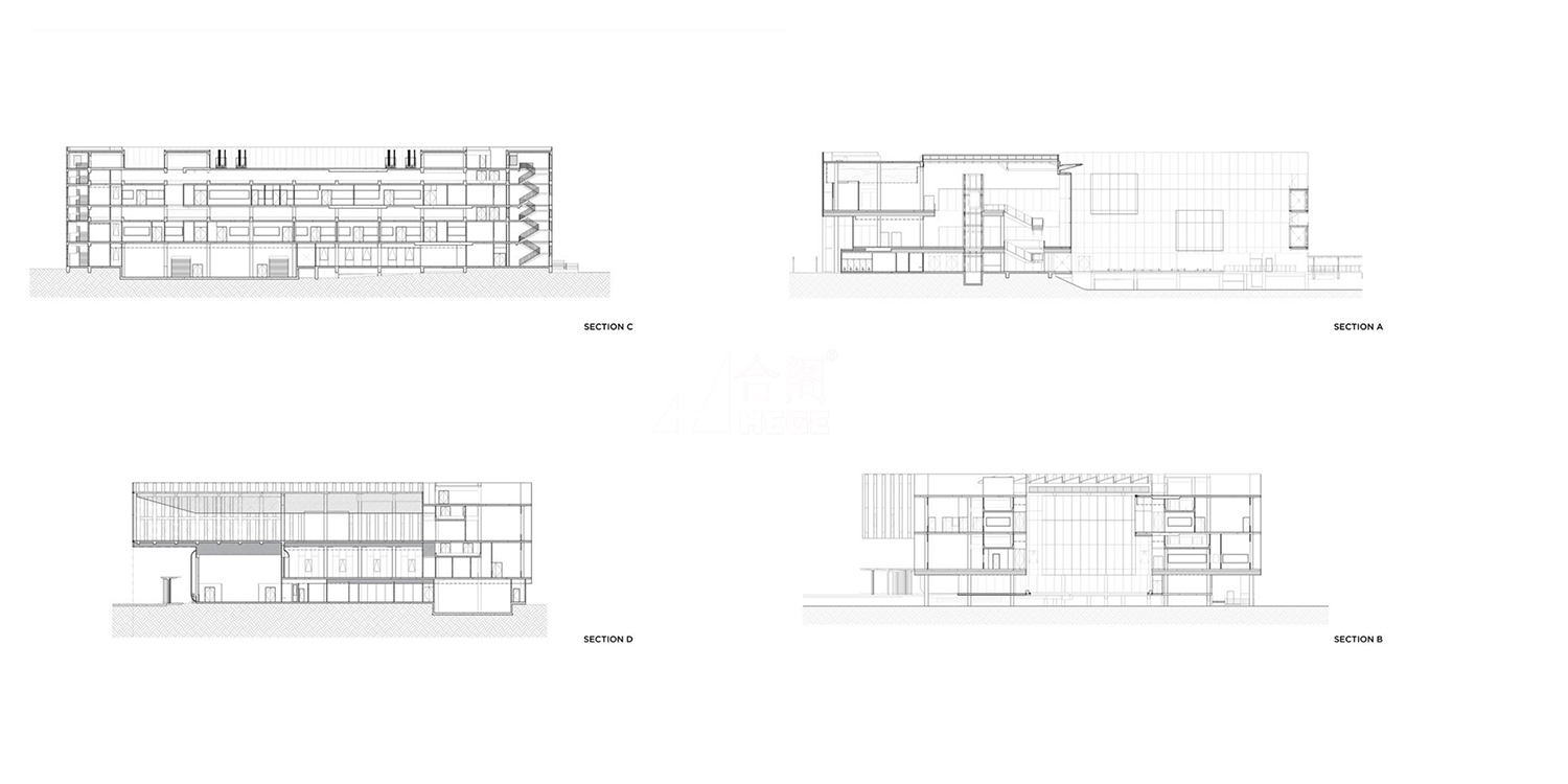U形的建筑群带有一个连接两栋研究楼的中央空间,缩短了两栋楼之间的步行距离并且为讨论和互动预留了足够的空间。这些实验室呈东西方向排布,以最大程度地减少进入建筑物地阳光,而15米的深度又能保证有充足的自然光可以进入室内。公共区域(例如会议室和展览空间)位于底层,以方便人们使用。研究实验室、办公楼等一些保密区域则位于较高楼层。