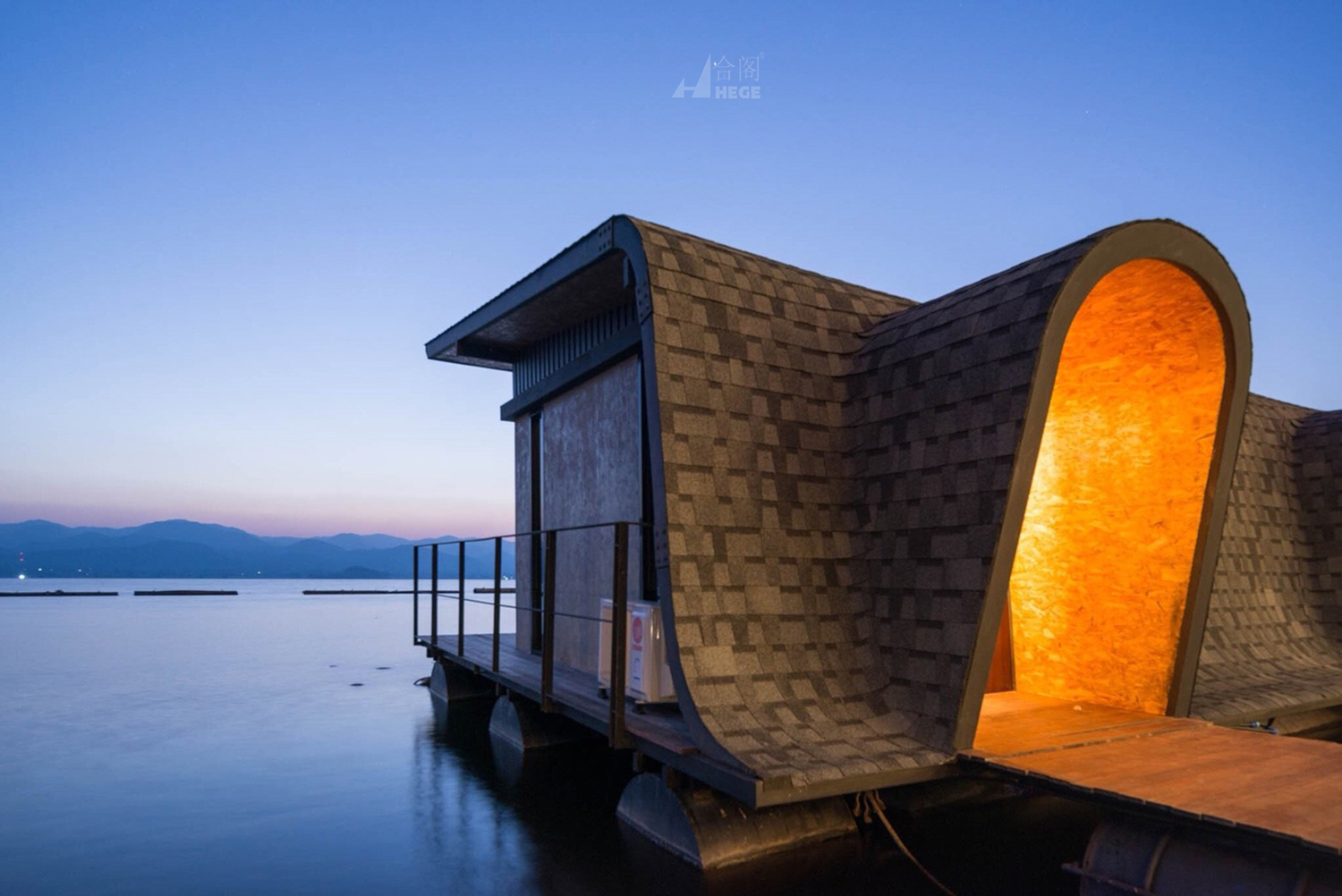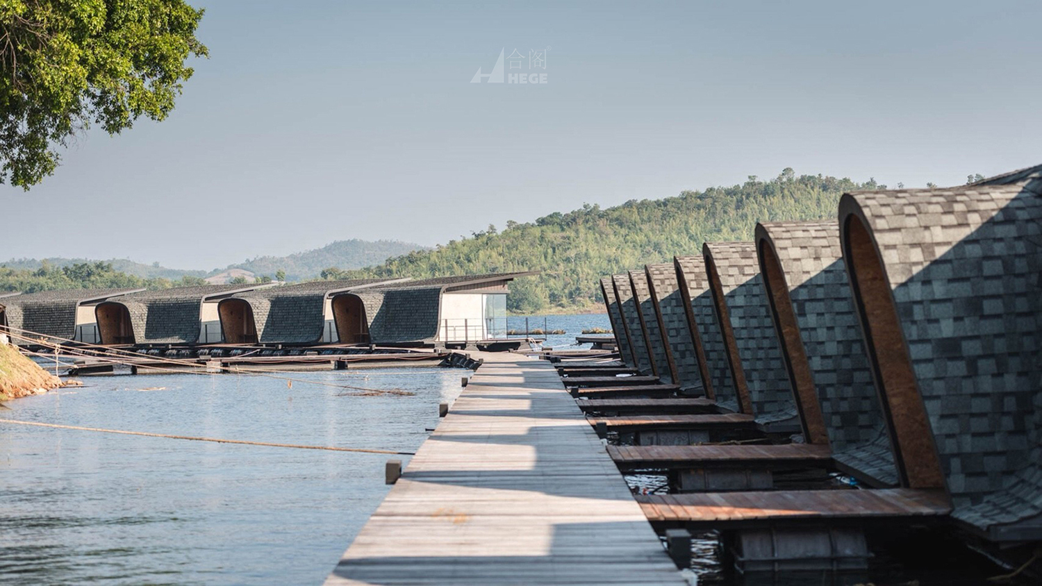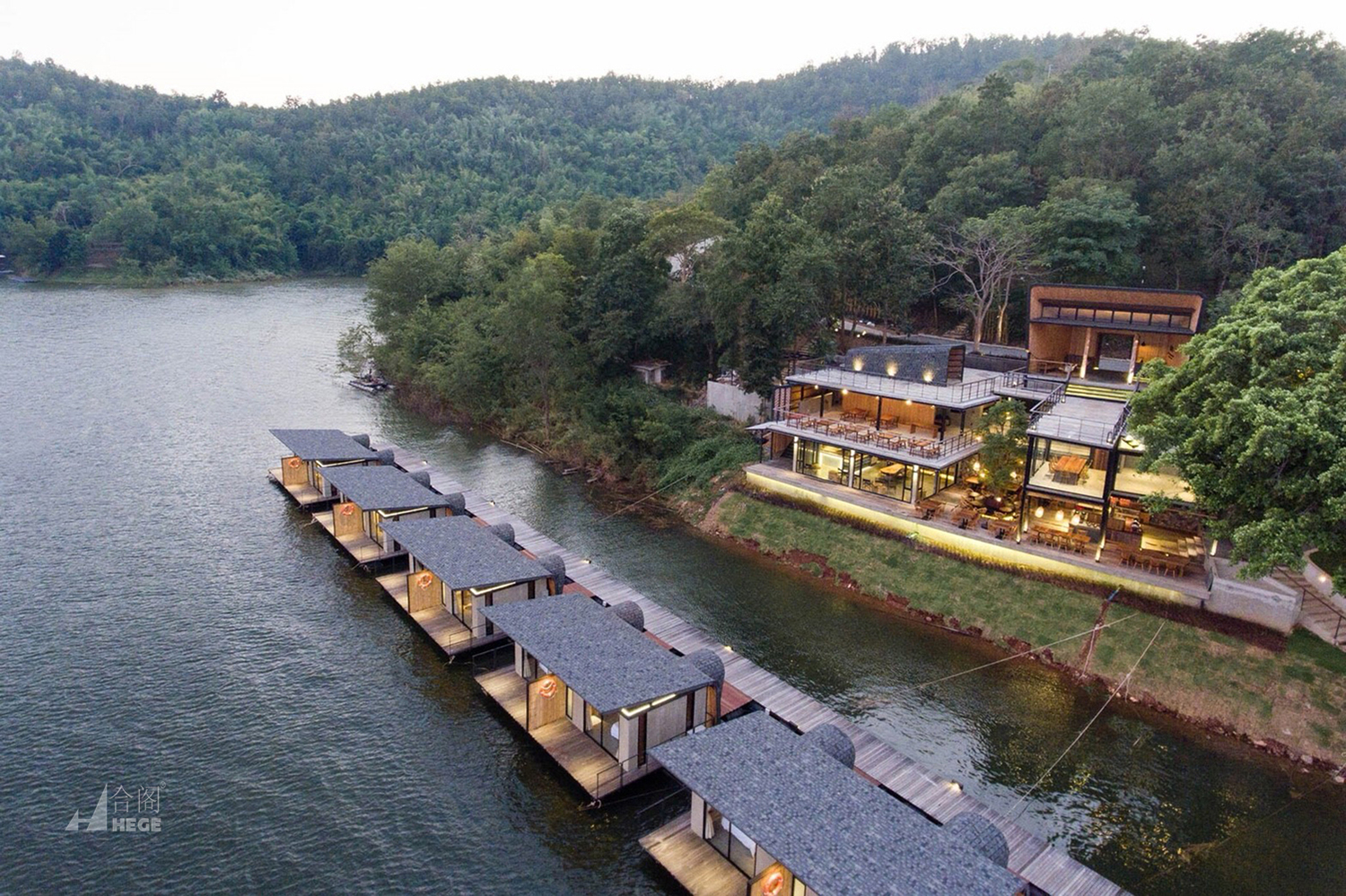 该度假酒店是一个漂浮度假胜地,以自然为导向,提供私人陆上住宿和舒适的漂流住宿。每个建筑都利用自然通风,形状和颜色与山景和湖景的吸引力紧密地融合在一起。比例也符合环境。线条明显地代表了湖滨的自然文脉,大堂设计基于月亮的方向,这意味着度假村的猜测可以享受令人惊叹的“日出和日落”的风景。
