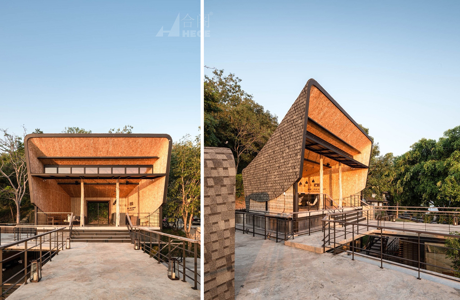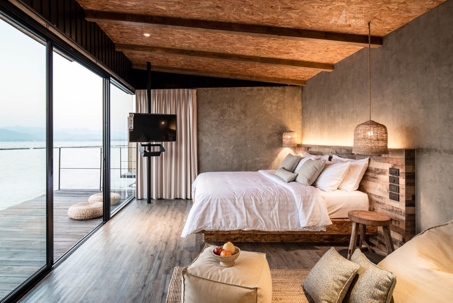 首先,重用。再利用的概念是指利用现有度假村的现有木材。这些旧木材被用作度假胜地的装饰品。作为天花板的OSB板是重用概念的另一个方面。这是因为OSB板是由多层的木片压缩而成的。