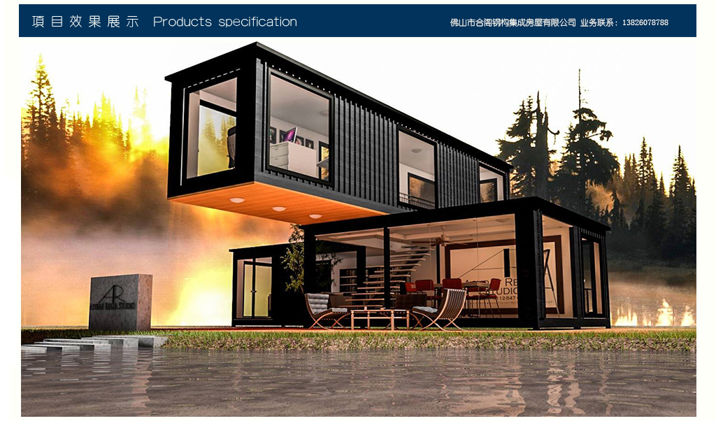 五、拆装方便,性能优越,稳定牢固,防震性能好,防水防火防腐,重量轻。房屋为整体结构,内有框架,墙体为钢板,可用木板饰面,可整体迁移,使用寿命可达20年以上。