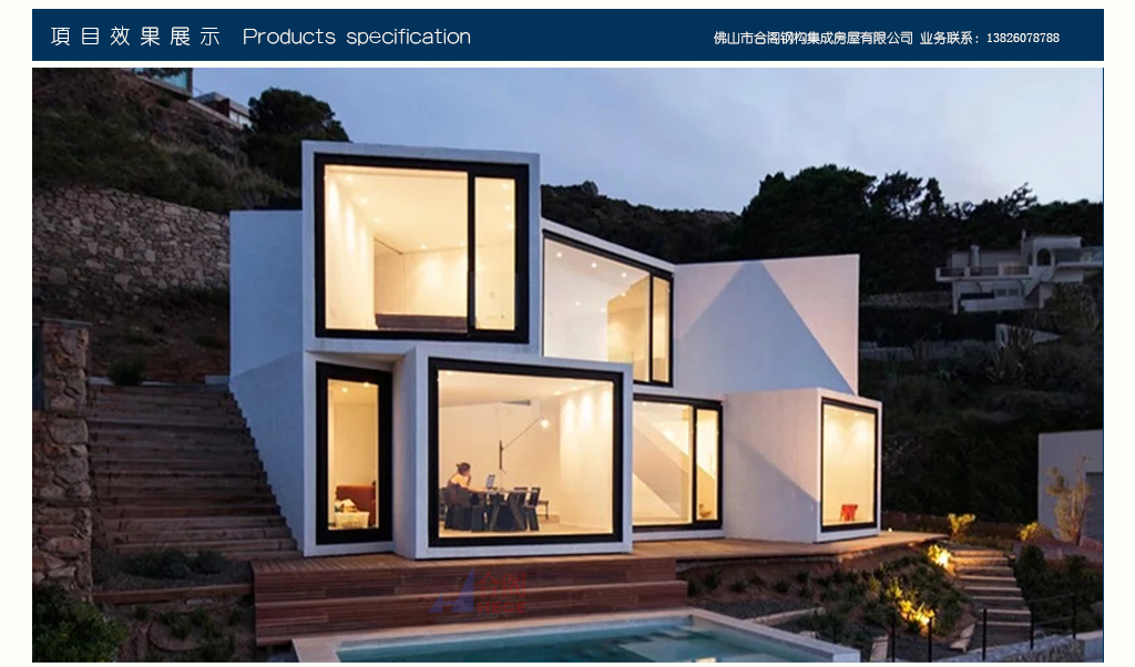 五、拆装方便,性能优越,稳定牢固,防震性能好,防水防火防腐,重量轻。房屋为整体结构,内有框架,墙体为钢板,可用木板饰面,可整体迁移,使用寿命可达20年以上。