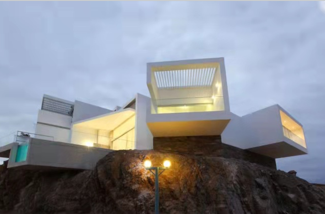 为了充分利用这一地块,建筑师设计了较大的悬挑结构,这是由于该地块的可用面积缩小了,而建筑已经达到了最大高度。两层的客厅和餐厅区域的尽头是游泳池和一个与之垂直的露台。家庭娱乐室位于二层,对一层的客厅和餐厅是开放的,在家庭娱乐室中也能充分欣赏到海洋的景色。通往二层的楼梯由天然混凝土制成,跨过厨房上方,将厨房与客厅和餐厅区隔开。