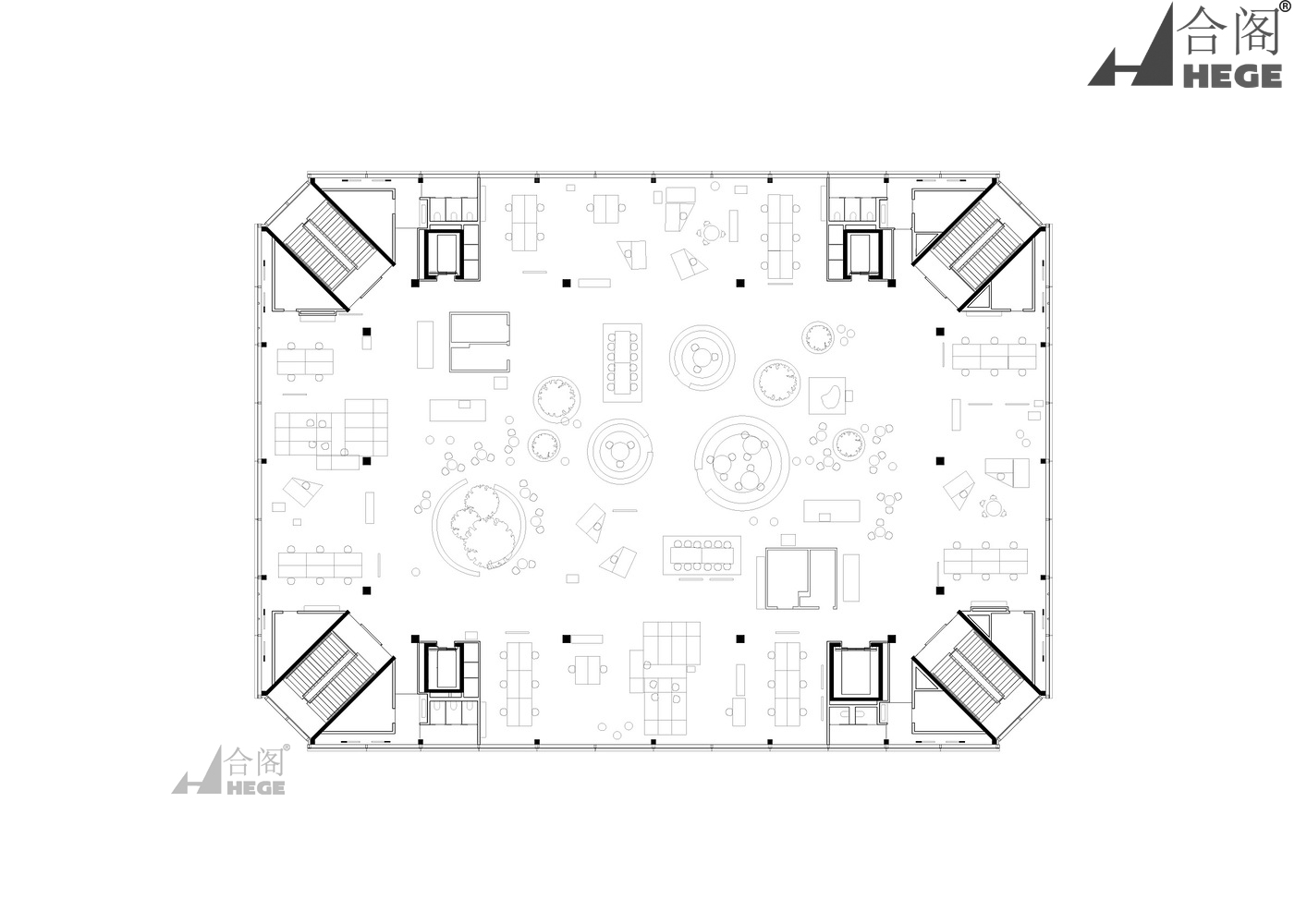 建筑一层的公共入口大厅通向一层和二层,所有楼层都通过建筑的楼梯连接,楼梯位于角落。四个楼梯一次又一次地从意想不到的角度出现,舒适的内部允许各种各样的聚会,从可定制的550个座位的礼堂,可以分割成三个独立的大厅,到高度集中的个人工作区域。独立的工作空间、可调节的办公桌和封闭的隐私区域与分散在开放平面上的会议室混合在一起。