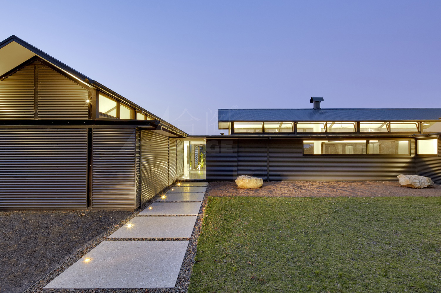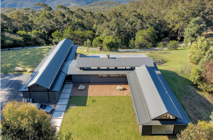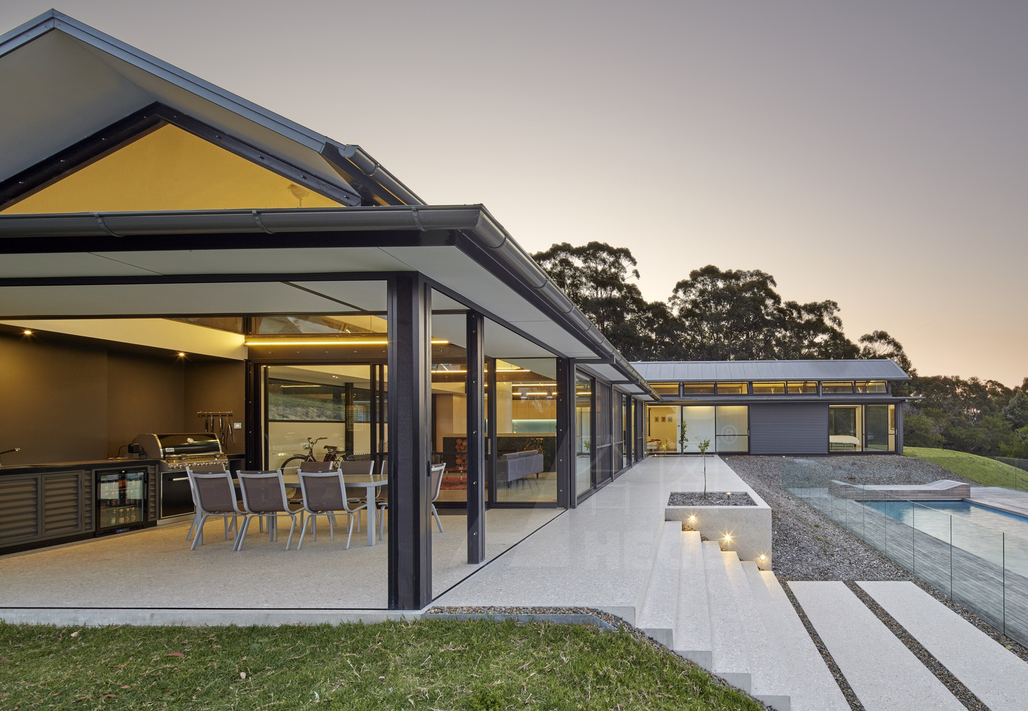 这座度假村别墅坐落在山顶上,俯瞰着袋鼠河对岸的山谷,四周被国家森林所环绕。住宅被设计成一系列相互连接的亭子,在南侧形成一个受保护的入口庭院,并向北侧的周围景观开放。该住宅的设计是低维护和坚固的,并使用被动式环境控制,如太阳能在地板上促进循环加热,天花板风扇辅助的交叉通风,丰富的自然光线,LED照明,以及15万升水储存和可发电5千瓦时的光电板和现场废物处理。房子的位置允许每个房间都能看到景色和侧面,并围绕着中央位置的开放式客厅连接,开放式的壁炉、高高的天花板和从泳池到远处的山谷的视野。