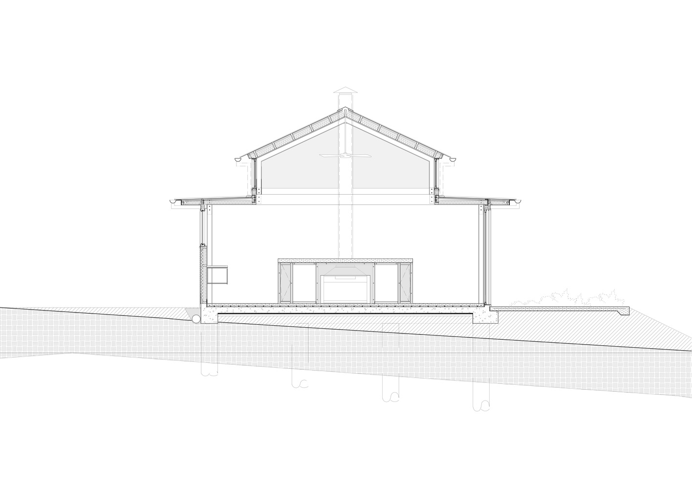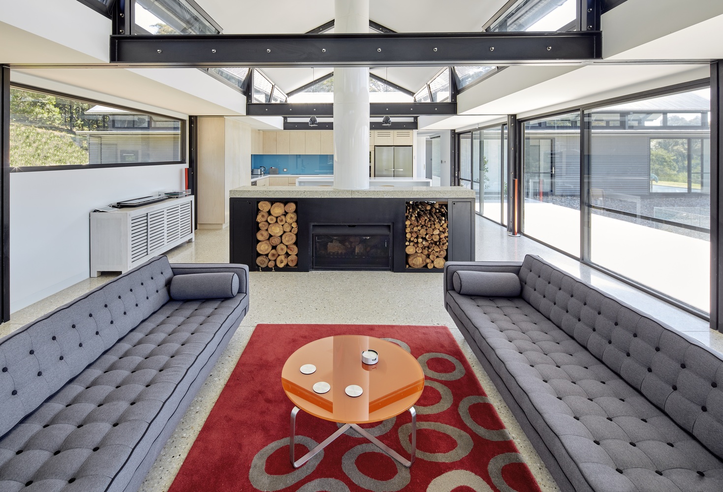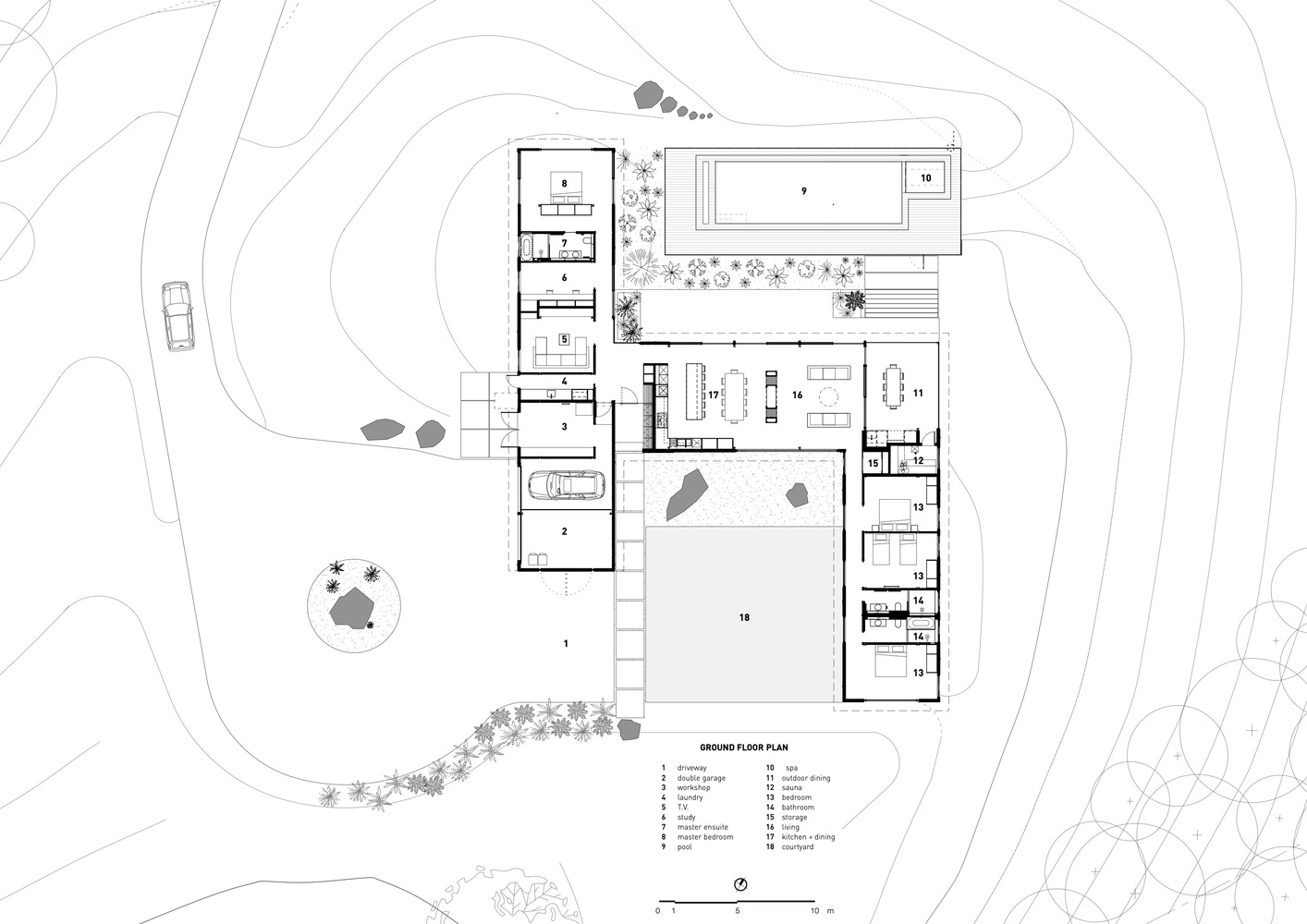 这座度假村别墅坐落在山顶上,俯瞰着袋鼠河对岸的山谷,四周被国家森林所环绕。住宅被设计成一系列相互连接的亭子,在南侧形成一个受保护的入口庭院,并向北侧的周围景观开放。该住宅的设计是低维护和坚固的,并使用被动式环境控制,如太阳能在地板上促进循环加热,天花板风扇辅助的交叉通风,丰富的自然光线,LED照明,以及15万升水储存和可发电5千瓦时的光电板和现场废物处理。房子的位置允许每个房间都能看到景色和侧面,并围绕着中央位置的开放式客厅连接,开放式的壁炉、高高的天花板和从泳池到远处的山谷的视野。
