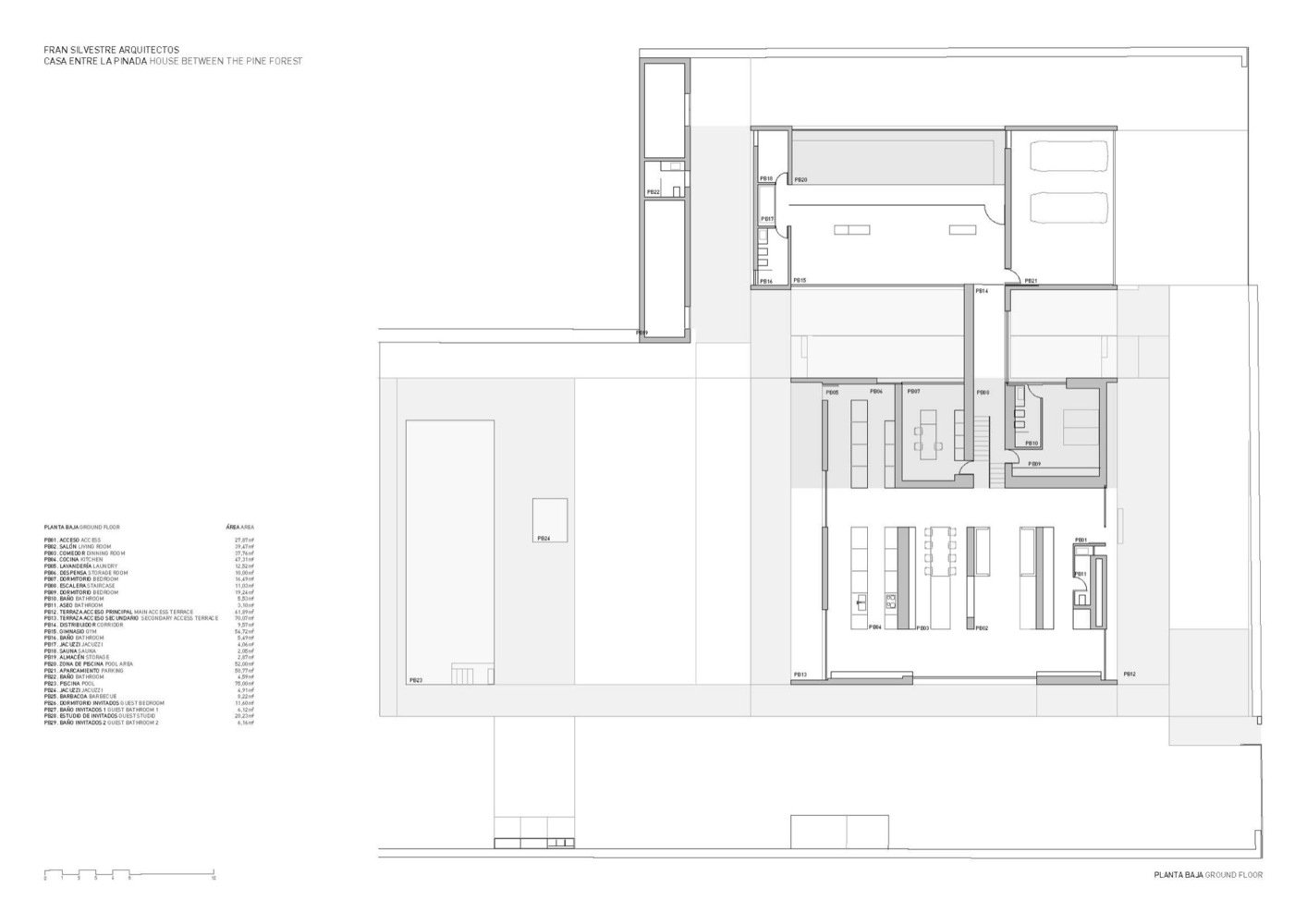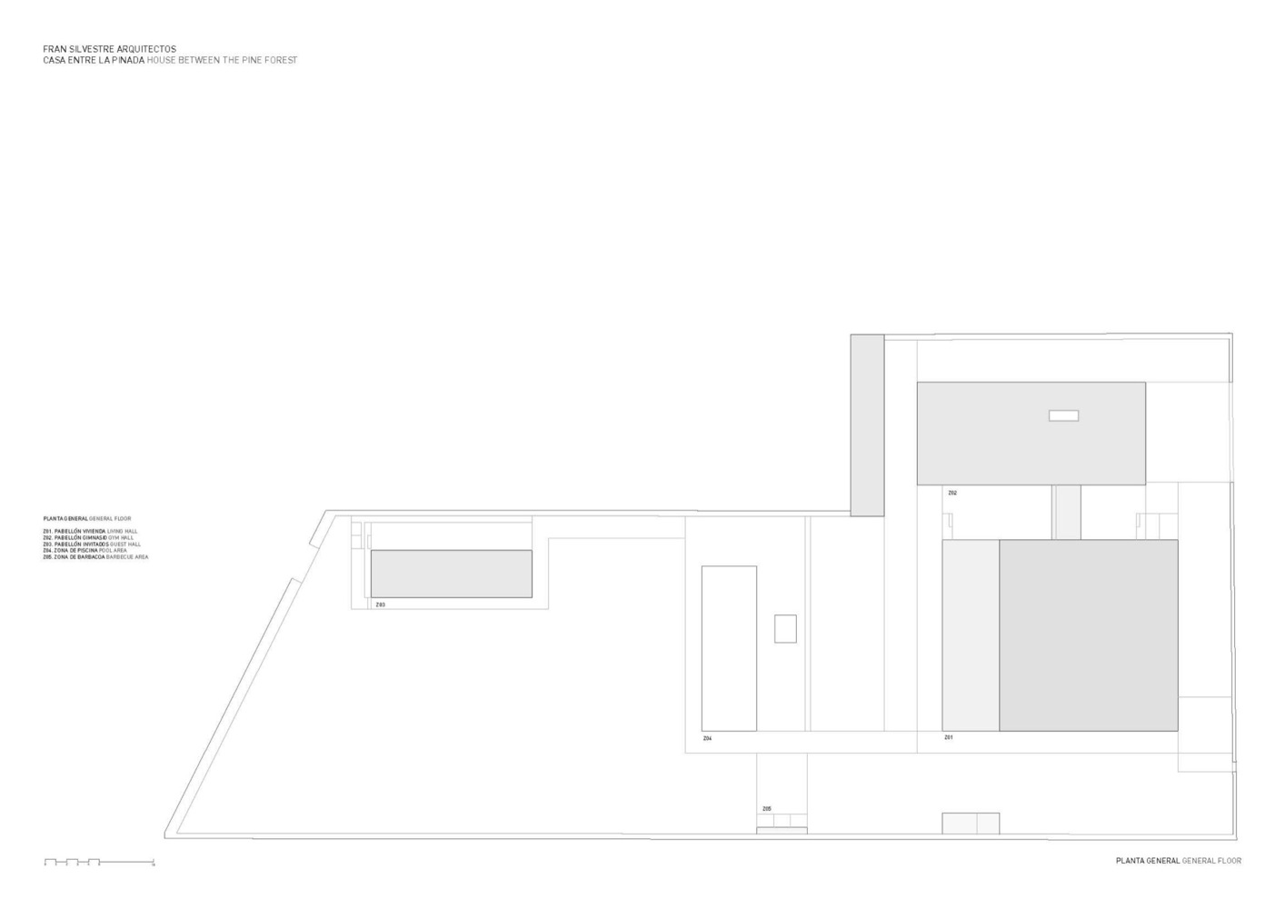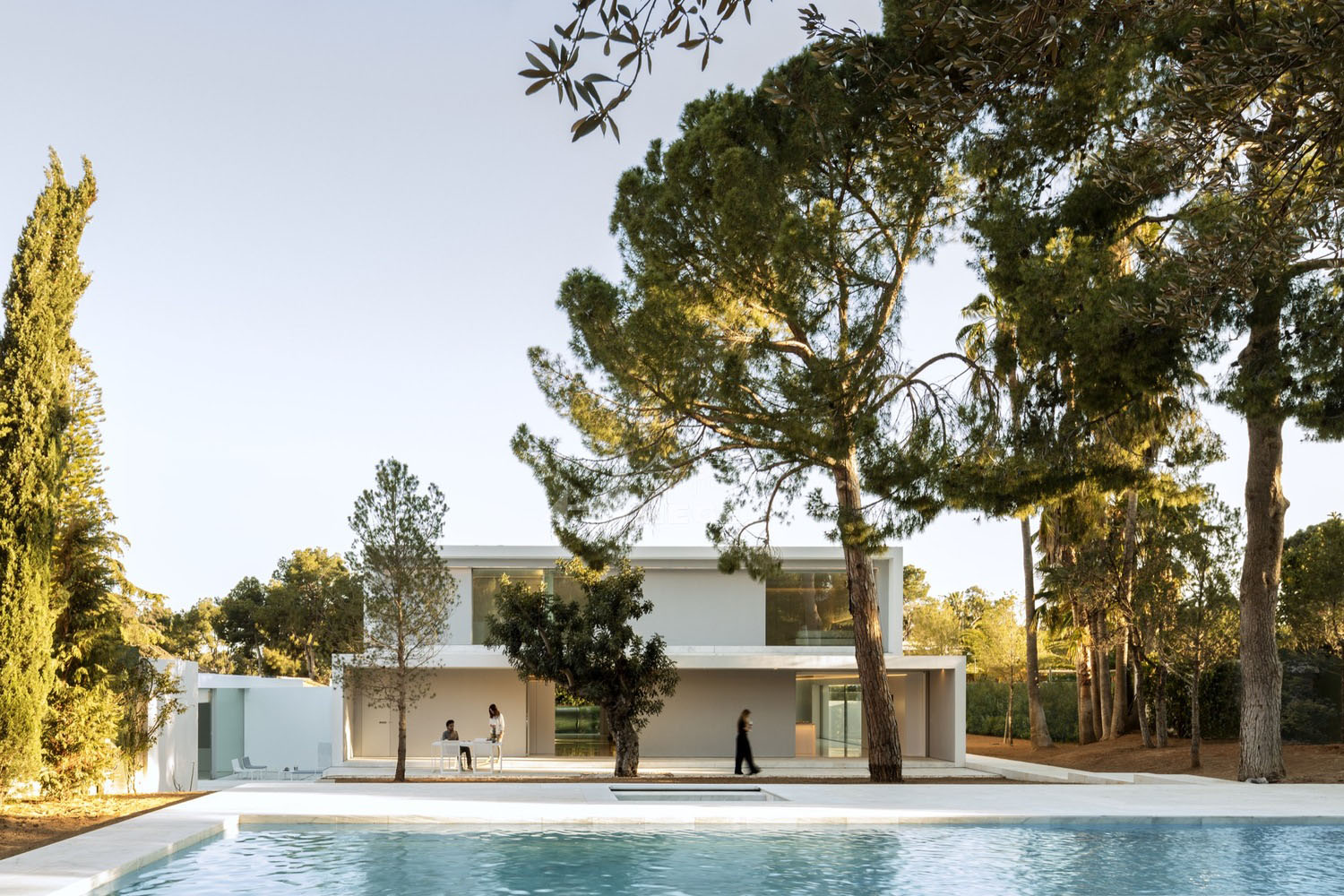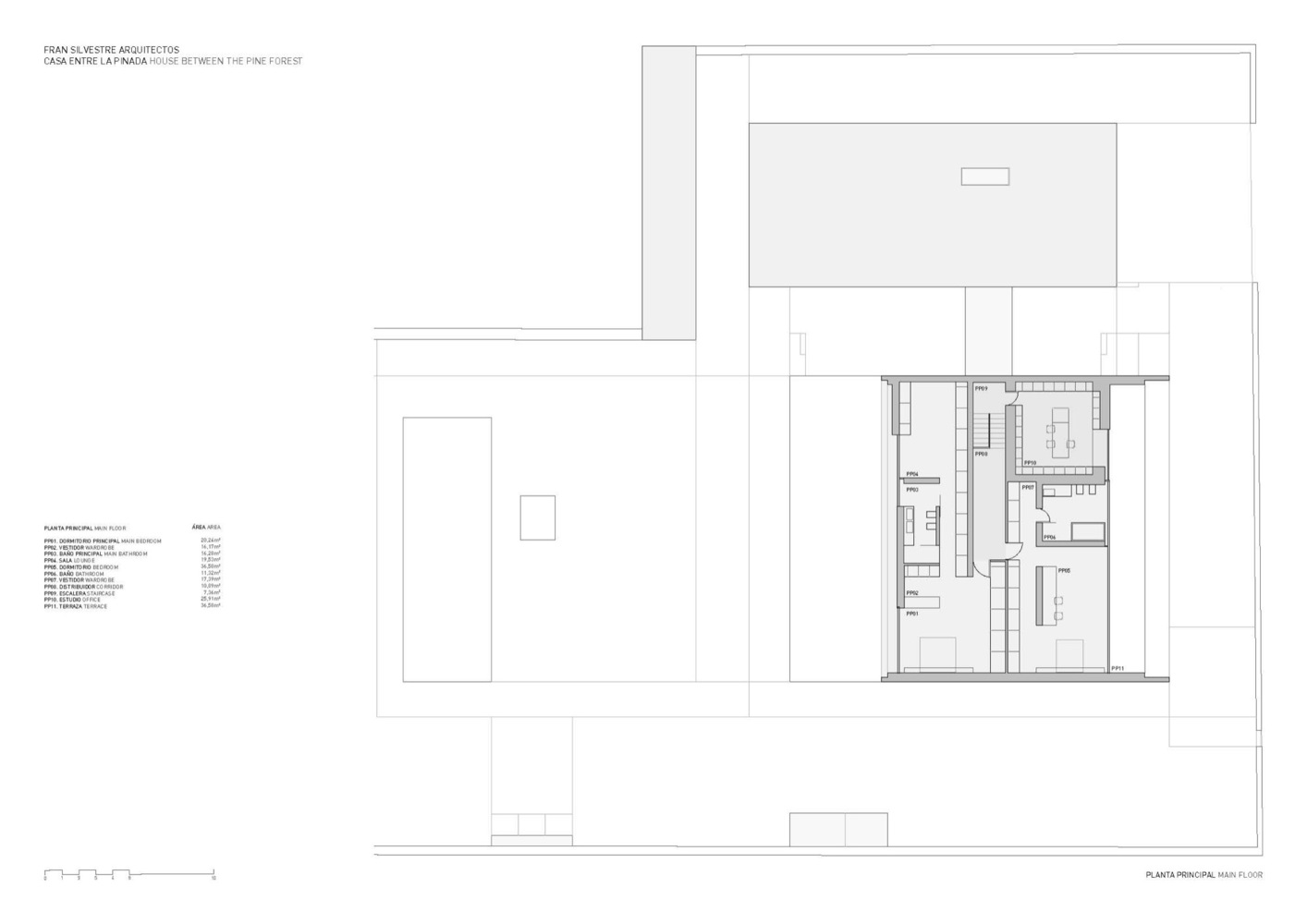 设计师在原有建筑的上面新增加了一个楼层,成为了这个新建筑一个新的空间。这样的话,休闲空间就有了地方,它可以包含在总的建筑范围内,并将那些小空间区域(院落,狭窄区域)聚合在一起后呈现出来,就像传统的地中海建筑一样。在室内,以中间层系统为主创建了一个大的不规则空间,其中有着各种不同的宽度和高度。原有建筑的支承结构里面设置了一些固定的家具,它们被涂成了灰色,像是树干一样,让人感觉就像住在花园里一样。这座位于松树林中的房子给人的感觉是一会儿像是穿梭在树林里,一会儿像是生活在美好的回忆中。