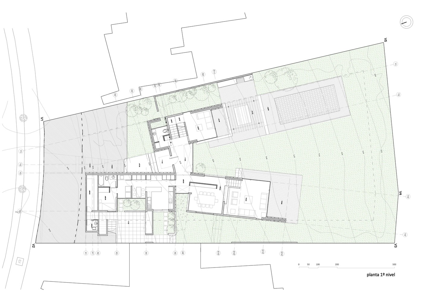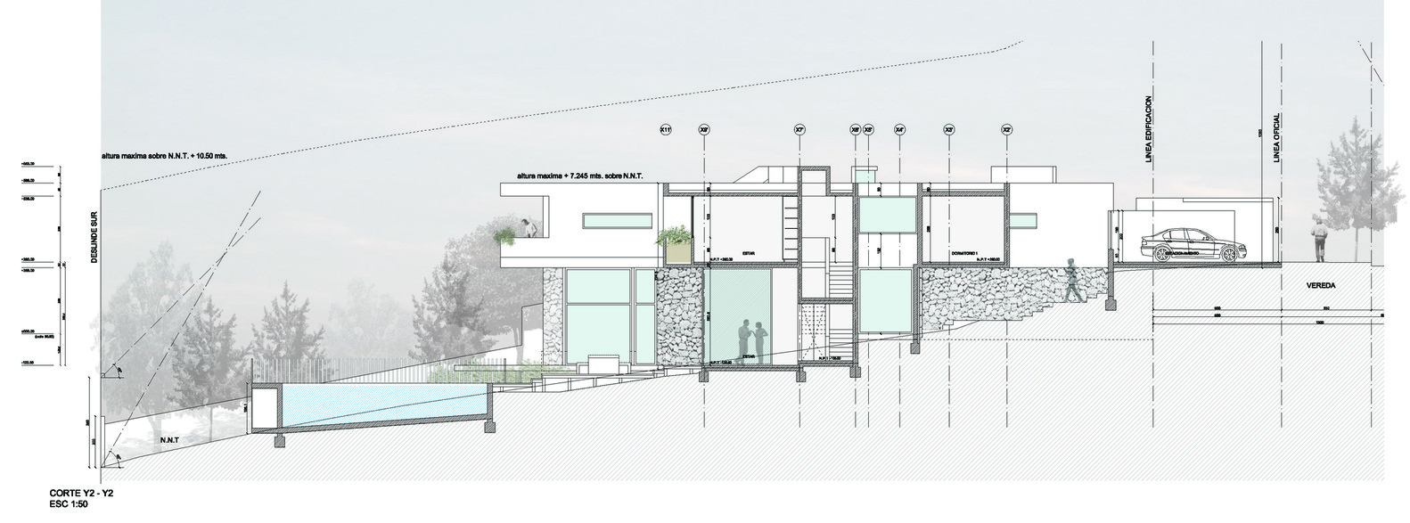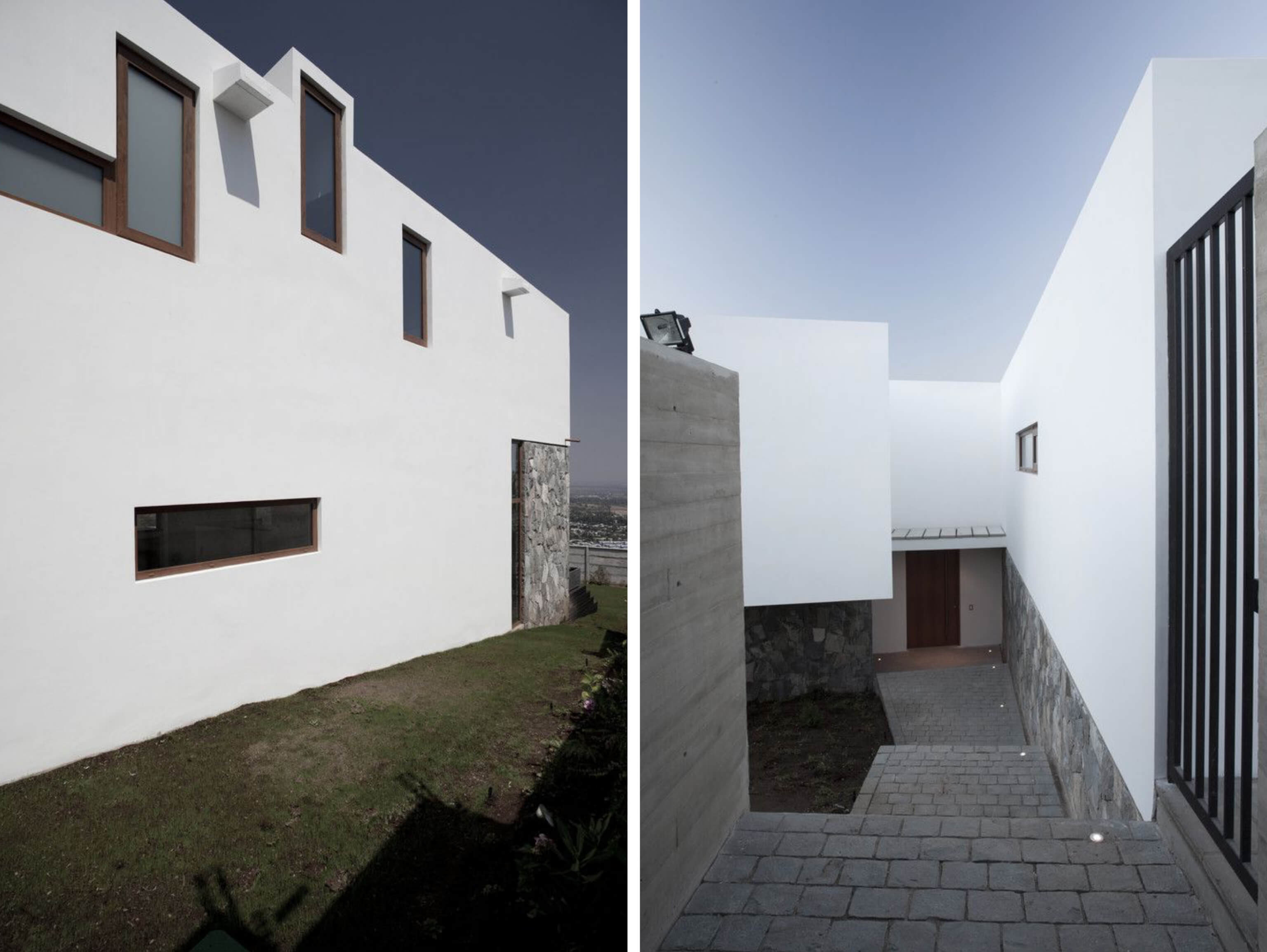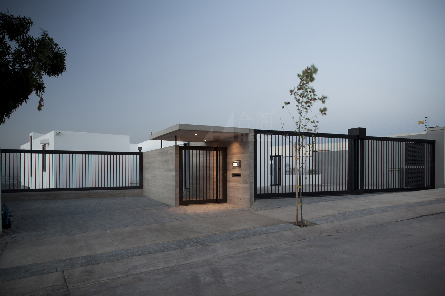 住宅位于一个形状非常特殊、带陡峭斜坡地盘,设计师设计了两个长条形体量,使它们在街道上保持低调、但像开路一般扩张进入场地,延伸城市山谷的景观(东南方向)。较低的高度使其直接与游泳池等室外元素互动,同时它包含沿着复杂地形的两层通高空间与大玻璃窗。入口层由一个有着干净白色外表面的配筋砌体下部塑造,所有空间均在同一标高。双层通高大厅连接两个构成住宅的体量。几个庭院及露台分布在整个住宅,给业主一个身处室外机会并创造了自然通风采光。