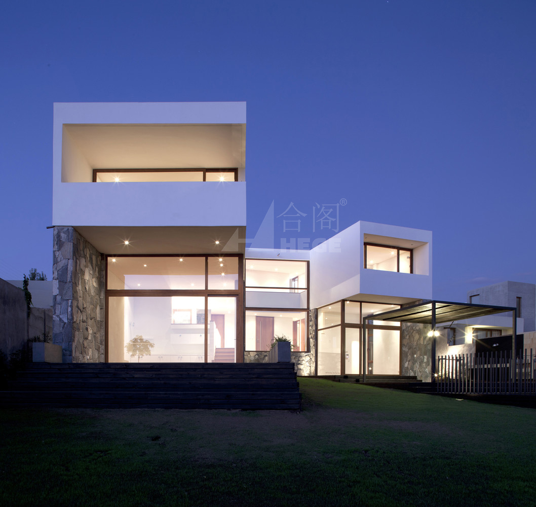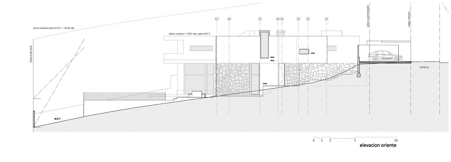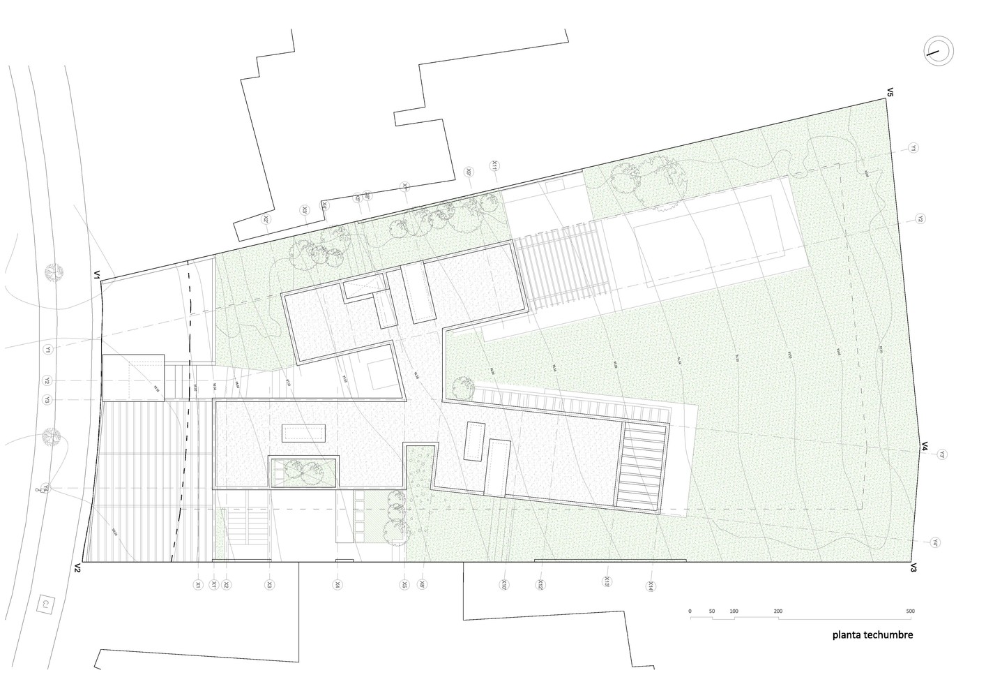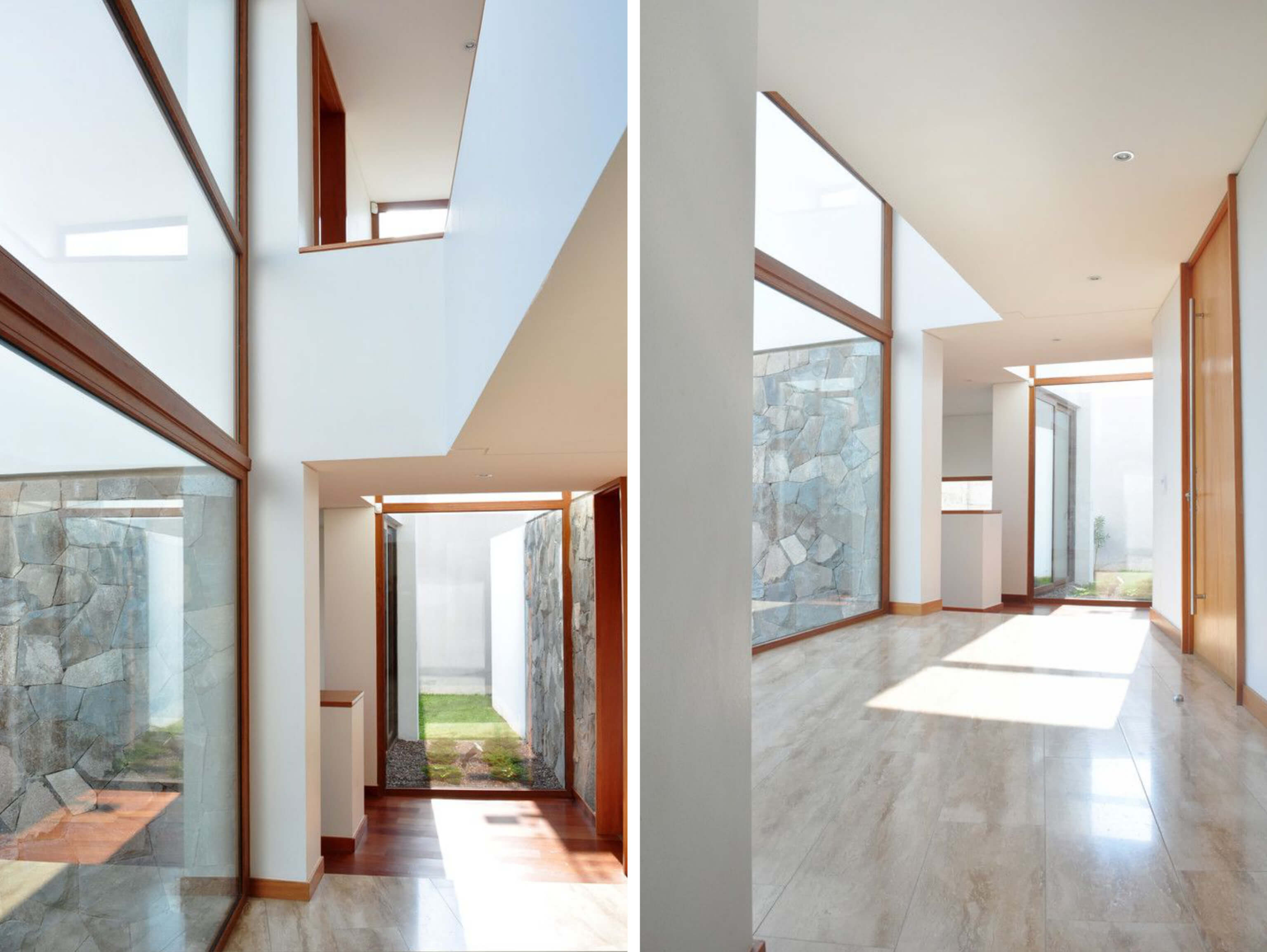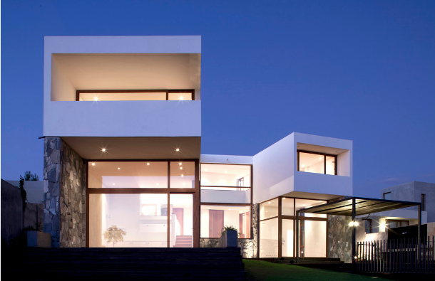 住宅位于一个形状非常特殊、带陡峭斜坡地盘,设计师设计了两个长条形体量,使它们在街道上保持低调、但像开路一般扩张进入场地,延伸城市山谷的景观(东南方向)。较低的高度使其直接与游泳池等室外元素互动,同时它包含沿着复杂地形的两层通高空间与大玻璃窗。入口层由一个有着干净白色外表面的配筋砌体下部塑造,所有空间均在同一标高。双层通高大厅连接两个构成住宅的体量。几个庭院及露台分布在整个住宅,给业主一个身处室外机会并创造了自然通风采光。