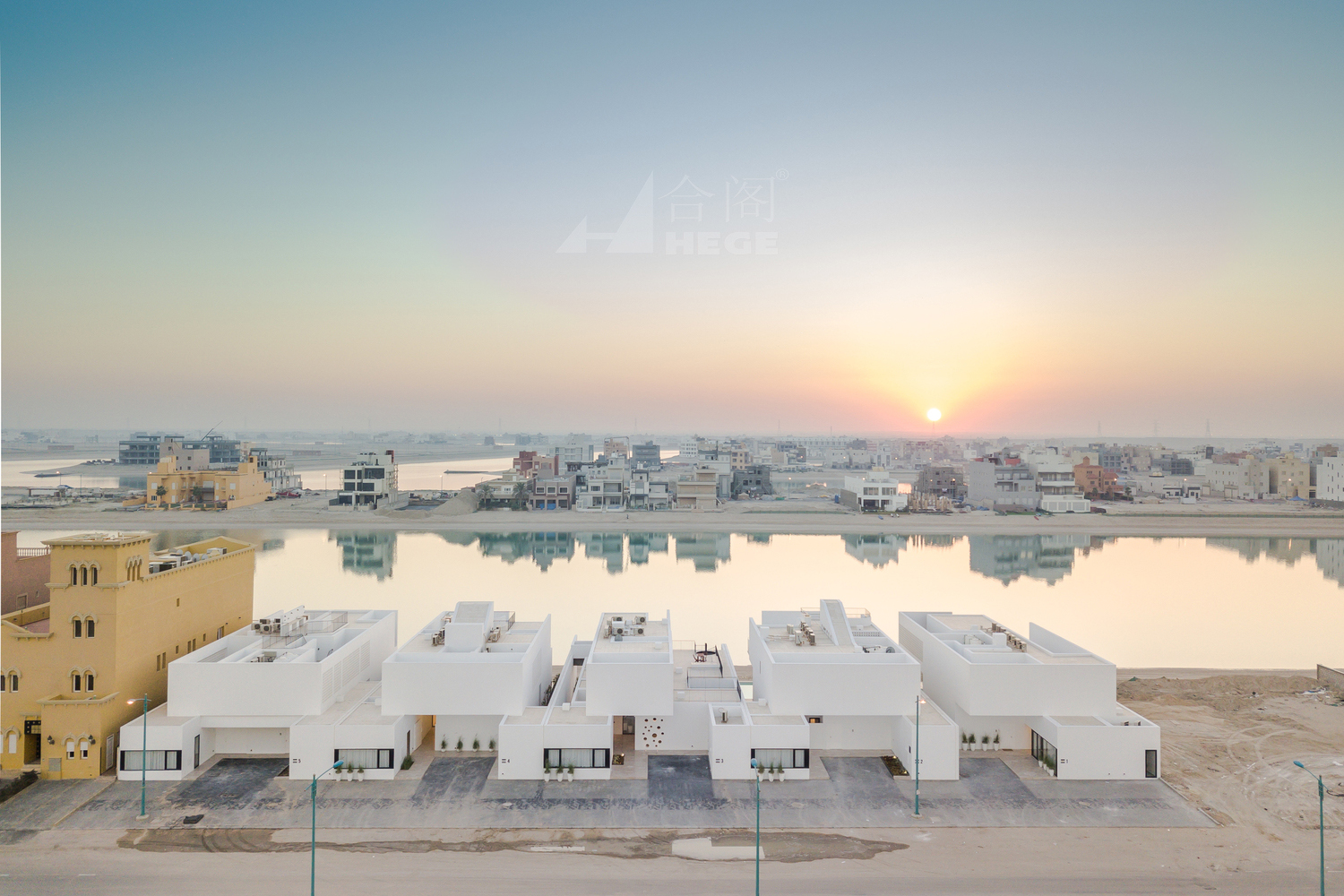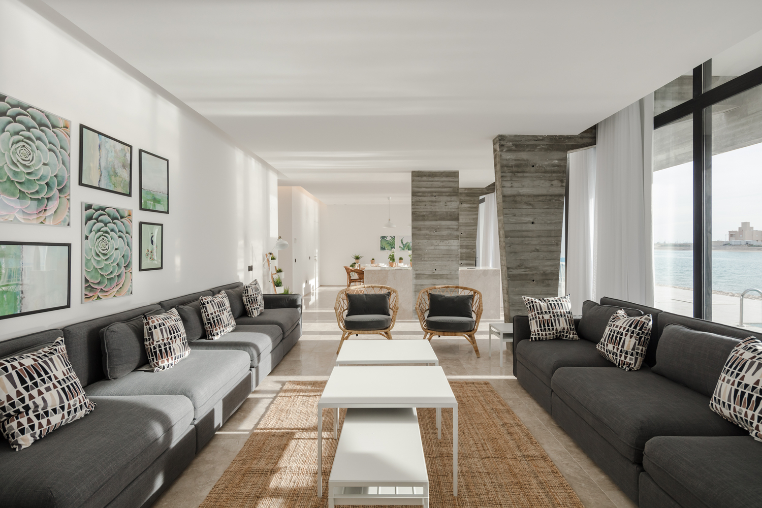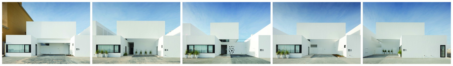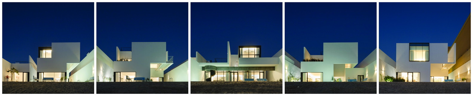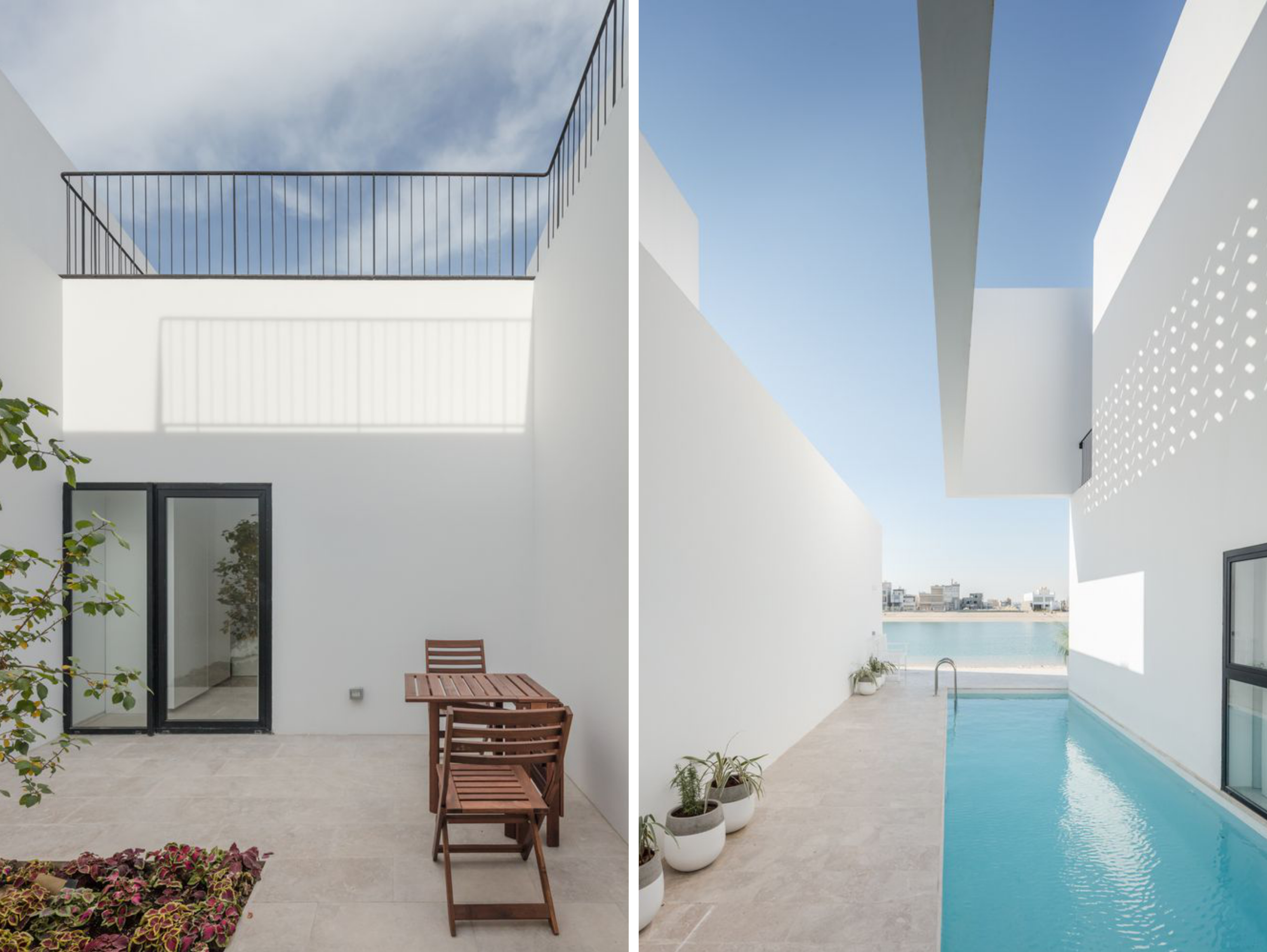 这个开发项目旨在延长可可接近的海岸线长度,让大海流进沙漠,创造出一系列由多个码头和船坞相连的运河,并受到许多其他娱乐活动的激活。这五个住宅的地块坐落在可俯瞰大海的其中一条内运河旁。因此将主要日常生活区与海滩、外部庭院、花园和泳池区域相连。这些相互连接底层空间让居住者可以在其间自由穿梭,欣赏运河的独有景色,使整体空间的流动性最大化,并用舒适的方式将室内外联系起来,某种意义上突破了地块限制。在地块的另一侧,在入口旁边是为客人提供的一个正式社交聚会场所。