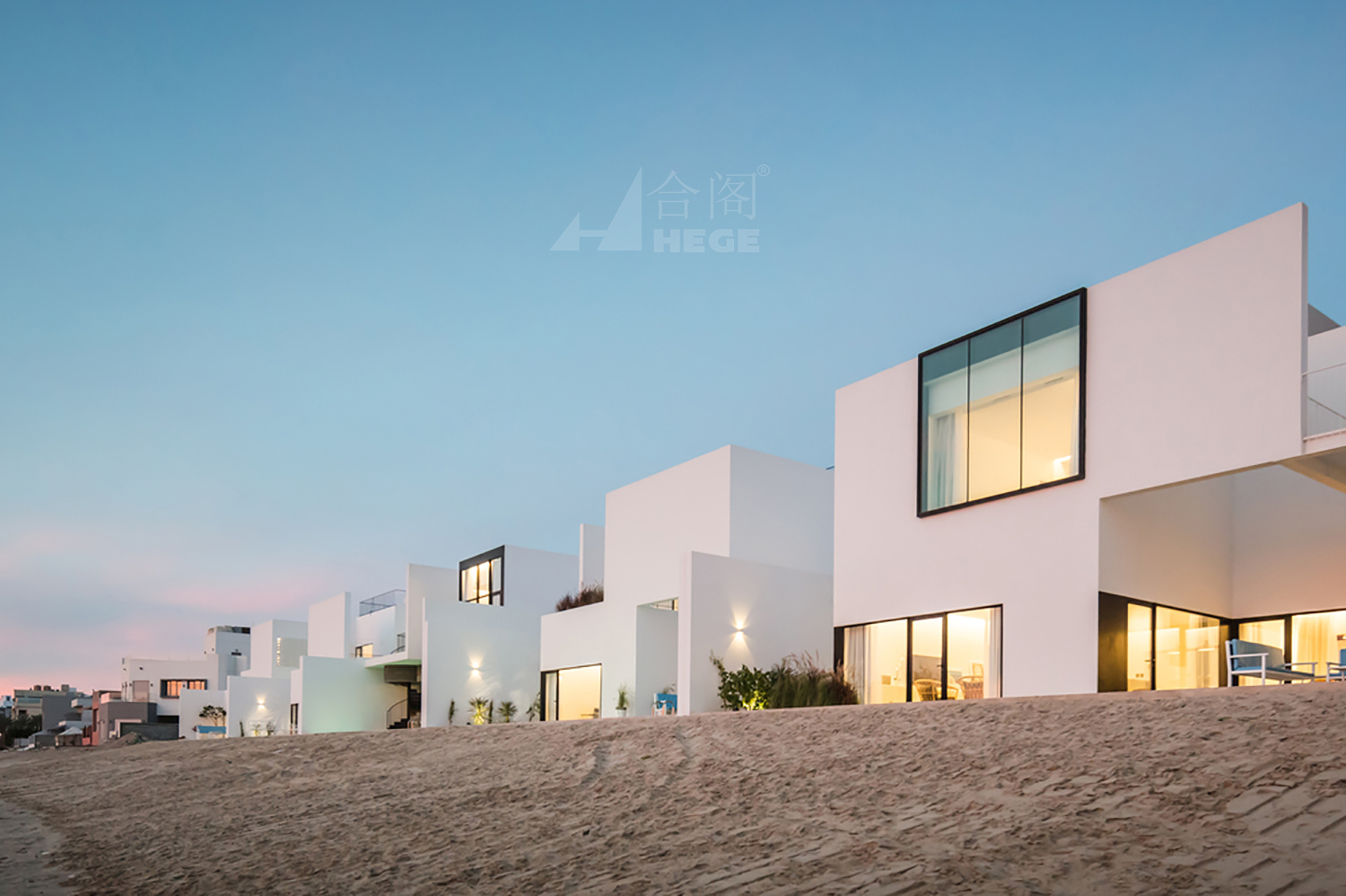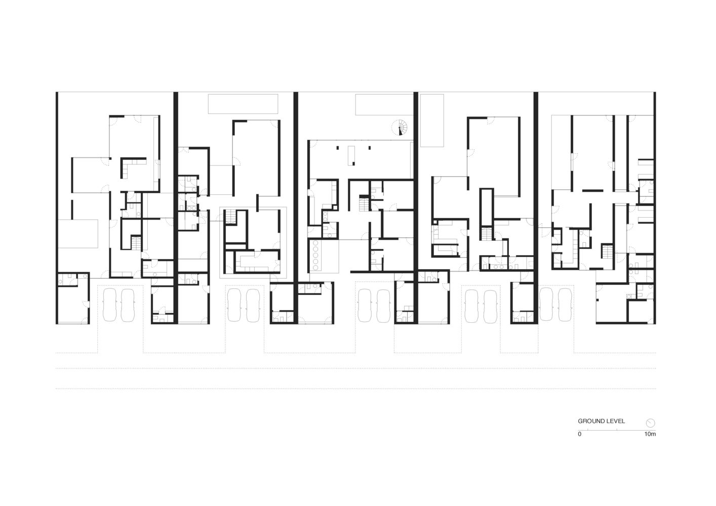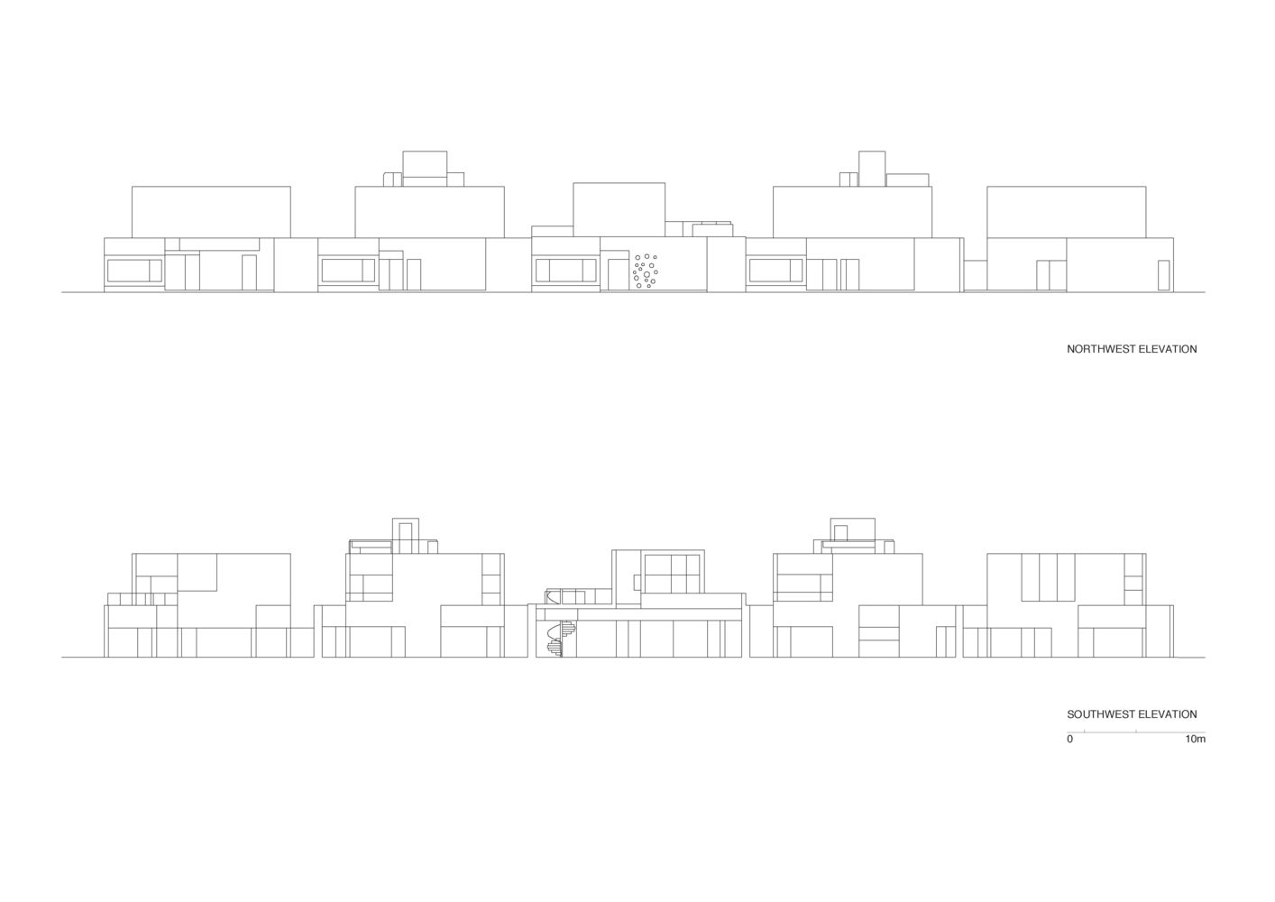 这个开发项目旨在延长可可接近的海岸线长度,让大海流进沙漠,创造出一系列由多个码头和船坞相连的运河,并受到许多其他娱乐活动的激活。这五个住宅的地块坐落在可俯瞰大海的其中一条内运河旁。因此将主要日常生活区与海滩、外部庭院、花园和泳池区域相连。这些相互连接底层空间让居住者可以在其间自由穿梭,欣赏运河的独有景色,使整体空间的流动性最大化,并用舒适的方式将室内外联系起来,某种意义上突破了地块限制。在地块的另一侧,在入口旁边是为客人提供的一个正式社交聚会场所。
