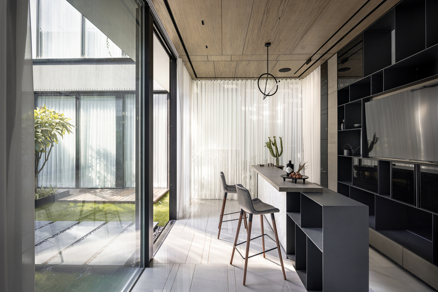 这是一座建筑,在那里实现了与森林绿色的和谐,没有不协调的感觉。为实现这一居住空间的建设,采用了深度为1.700 mm的深屋檐。一个舒适的中间区域创造了深屋檐,也是一个装置,非常自然地把周围的绿色带到室内。屋檐边缘的细节为整个屋顶创造了一种轻盈飘浮的感觉。您可以在无障碍房间周围走动,从每个房间都可以欣赏到风景,就像一扇用深邃的屋檐和甲板构成的画窗。