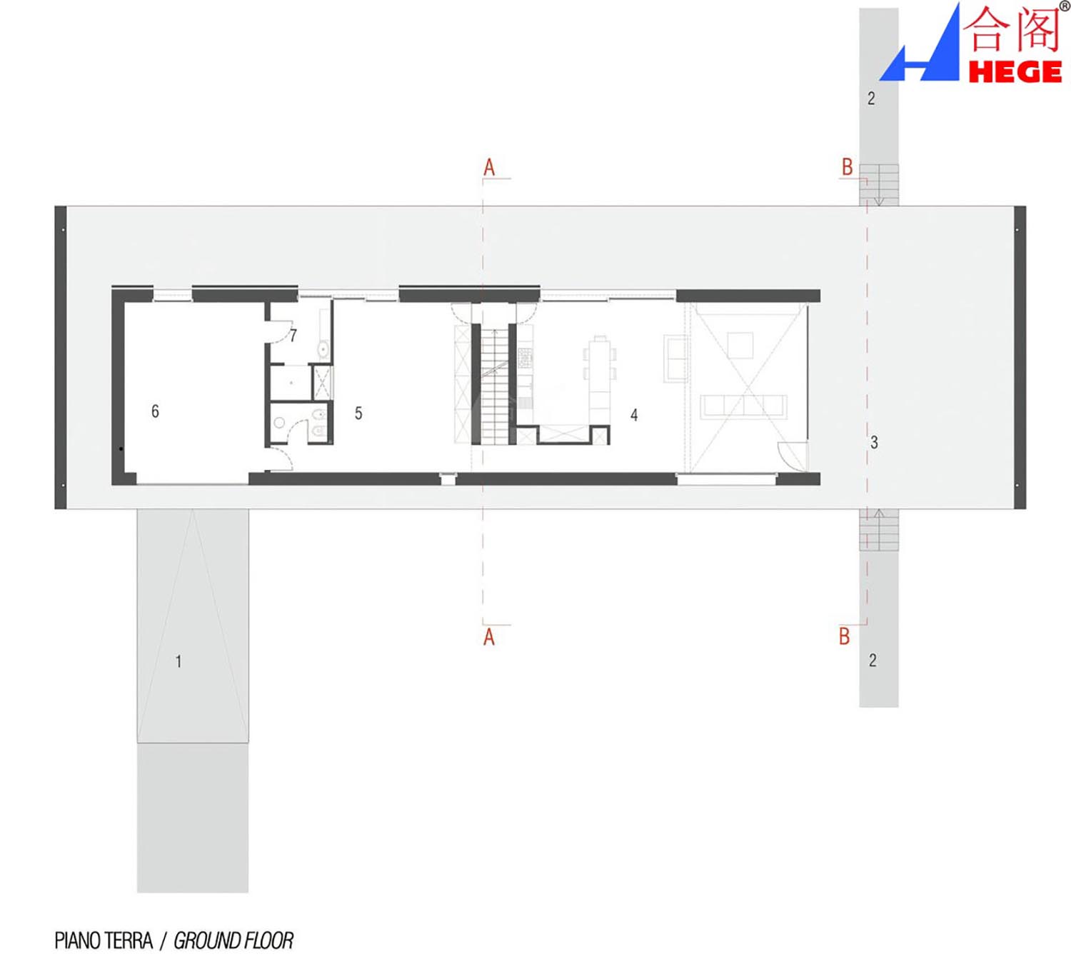 这个住宅的东北向由两个错列的部分构成,即门廊或气候缓解剂和住宅空间或绝缘体。它处于乡村景观和游客之间,到道路60米的距离。地板被抬高悬空于地面,来保护表面天气的高层并存储绝缘层的“氨土”。